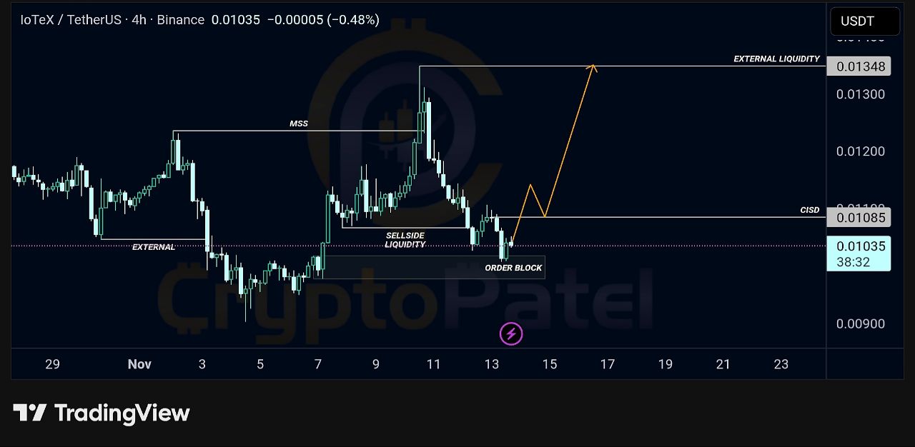 IOTX touches a bullish Order Block; a break above 0.01085 signals a bullish move toward 0.01348.