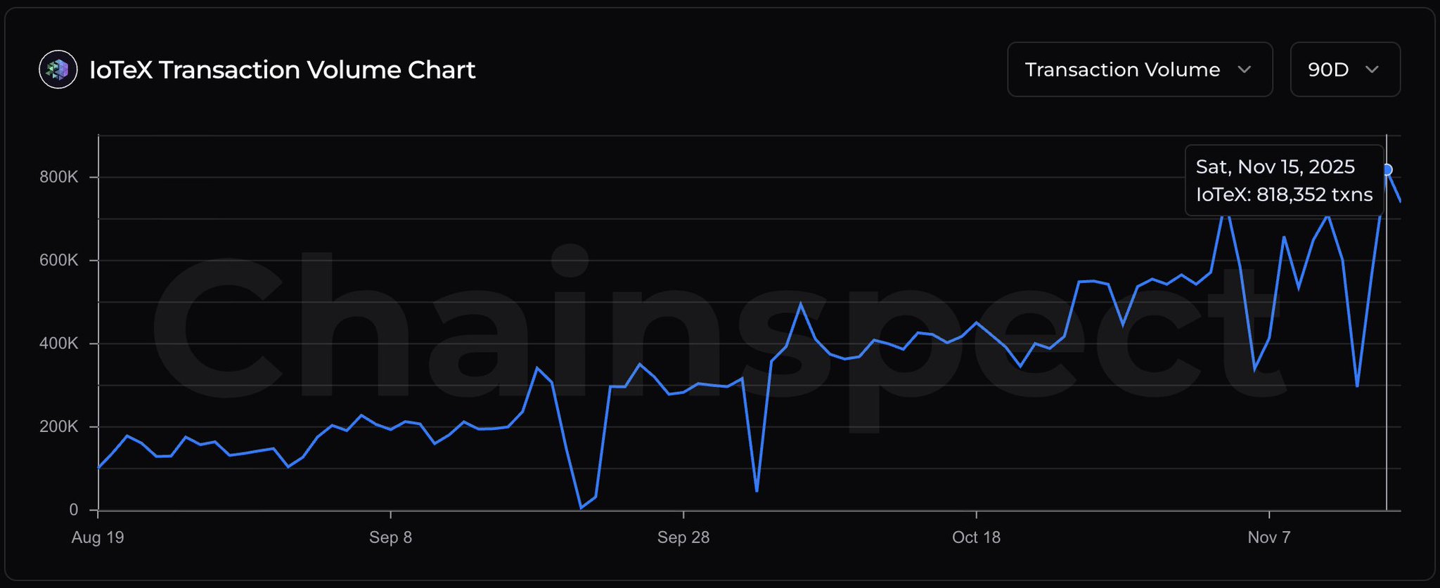 IoTeX transaction volume hits a 90‑day high, reaching 818,000 transactions, aiming to break 1 million.
