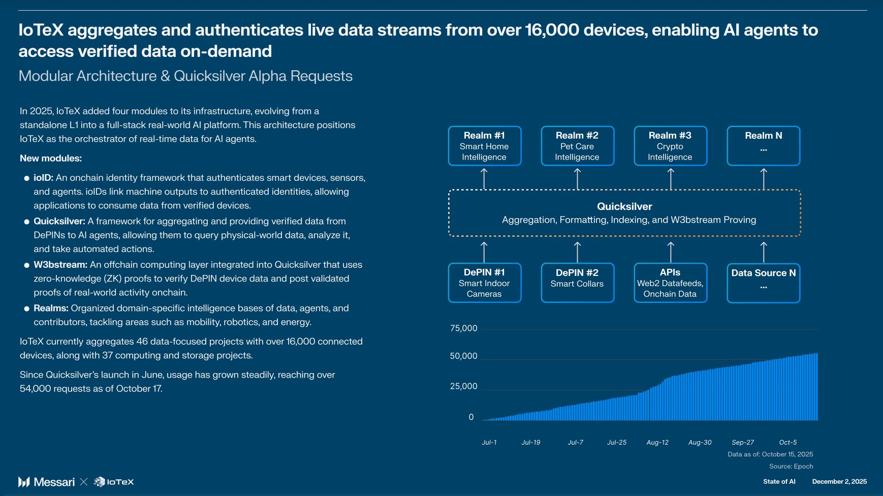 In 2025, @iotex_io evolved from a standalone L1 into a full-stack real-world AI platform to orchestrate real-time data for AI agents. IoTeX currently aggregates: - 46 data-focused projects with >16K connected devices, and - 37 computing and storage projects The @MessariCrypto State of AI report breaks down this & other key DeAI trends through 2025. Check it out: https://t.co/DqKus5uXTA