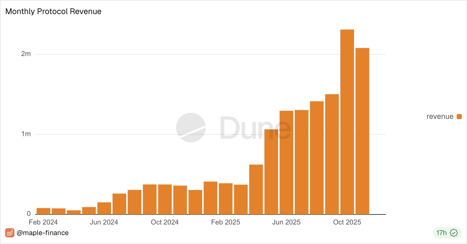McKenna FA_Analyst OnChain_Analyst B103.65K @Crypto_McKennaAnother strong month for Maple Finance earning >$2M with a strong path to further scale in 2026. Market conditions are seeing a reduction in borrow demand and loan book now standing at $1.5Bn. Internal targets are $100M ARR with $20Bn AUM by the end of 2026. Even if they hit 50% will be a huge win and that's where my expectations sit. Institutional borrow demand only going to accelerate from here lending market 2x in size in 2025 as per Galaxy reporting. Maple sits perfectly to capture this borrow demand. $SYRUP