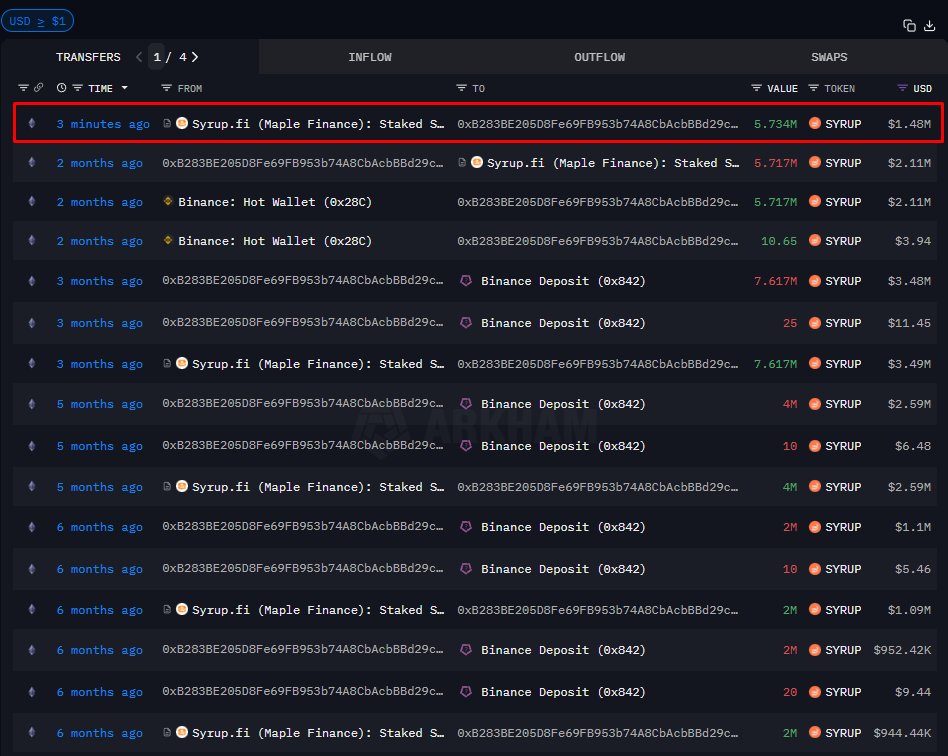 onchainschool.pro OnChain_Analyst Educator S4.46K @how2onchainPOTENTIAL $SYRUP EXCHANGE OUTFLOW AHEAD A wallet has recently unstaked $1.5M worth of $SYRUP Historically, after unstaking, this wallet sends tokens to exchanges, which is often followed by a price reaction These actions tend to occur once per quarter Wallet: 0xB283BE205D8Fe69FB953b74A8CbAcbBBd29c12ae