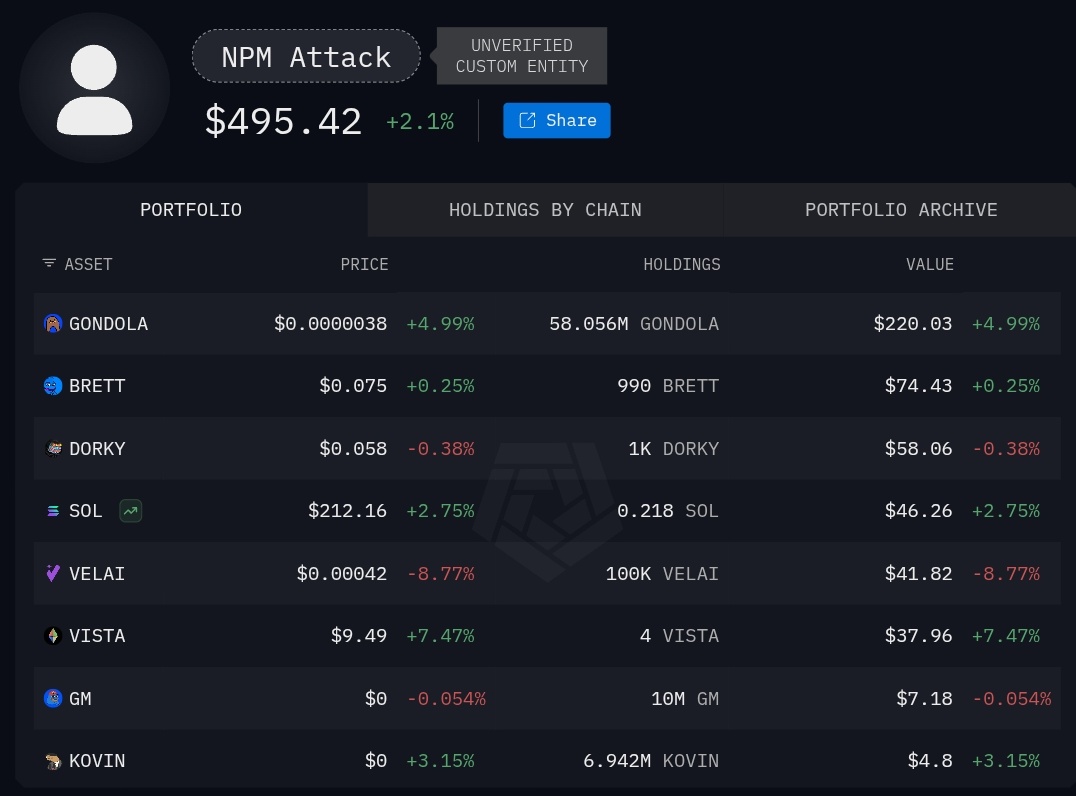 There has been a total of $495.42 stolen so far in the NPM supply chain attack, according to Arkham.