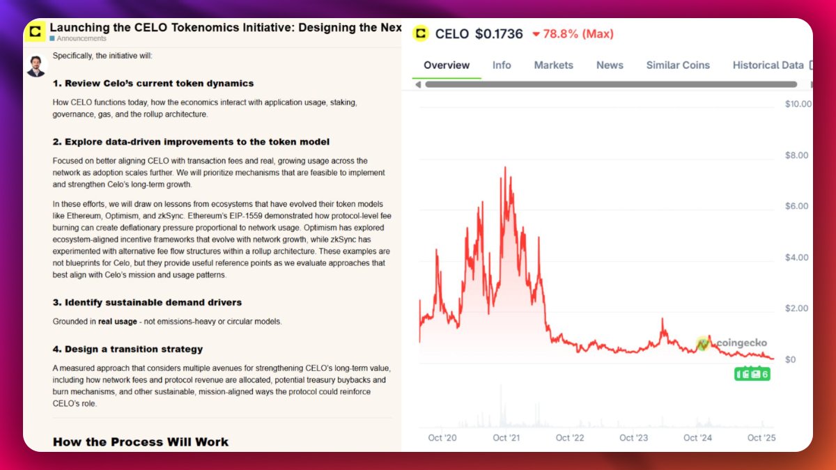 𝓢𝓸𝓯𝓲𝓪 (✧ᴗ✧) Researcher Influencer B6.48K @SofiaCryptoVibe➥ Celo just kicked off the Celo Tokenomics Initiative (a full reset of how CELO is designed for the next decade) They’re reviewing the full stack: - Staking - Governance - Gas fees - Rollup architecture And redesigning value flow: - Fees that scale with volume - Burn and buyback mechanisms - Tighter linkage between $CELO and onchain activity Quiet moves like this are usually where narratives start.