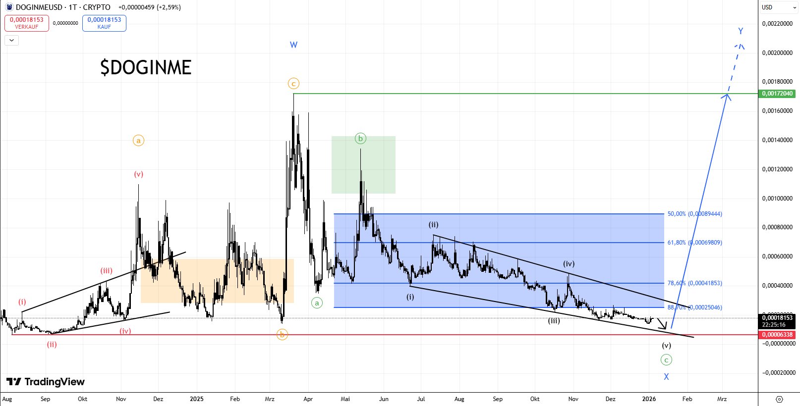 DOGINME is currently biased bearish and needs to break above the 88.7% Fibonacci level to start a new upward move.