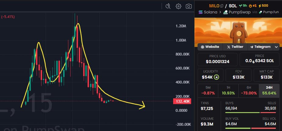 The tweet warns that MILO is a high-risk meme coin, with charts showing a typical pump-and-dump pattern, advising avoidance.