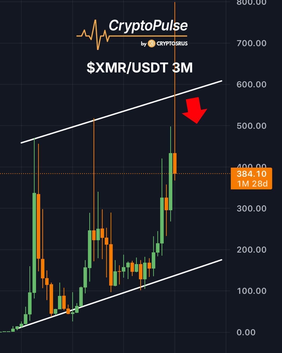 On the 3M chart, Monero is rejecting the upper channel resistance after a strong run-up.