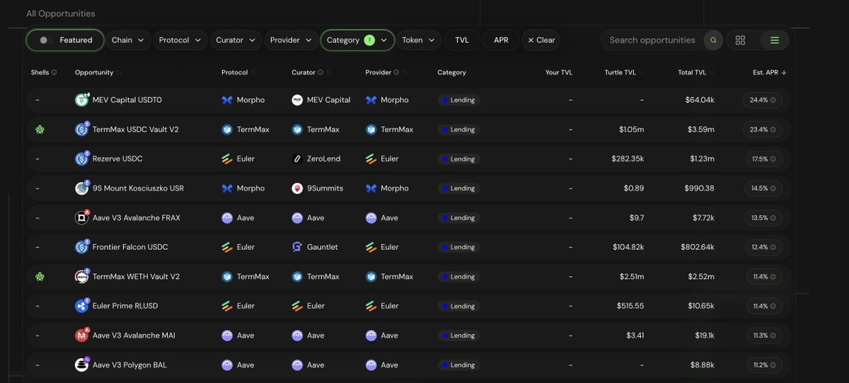 2) All major lending protocols are now live on Turtle. Whether it's Aave, Morpho or Euler: you can find, research and deposit through Turtle's "Opportunities" page