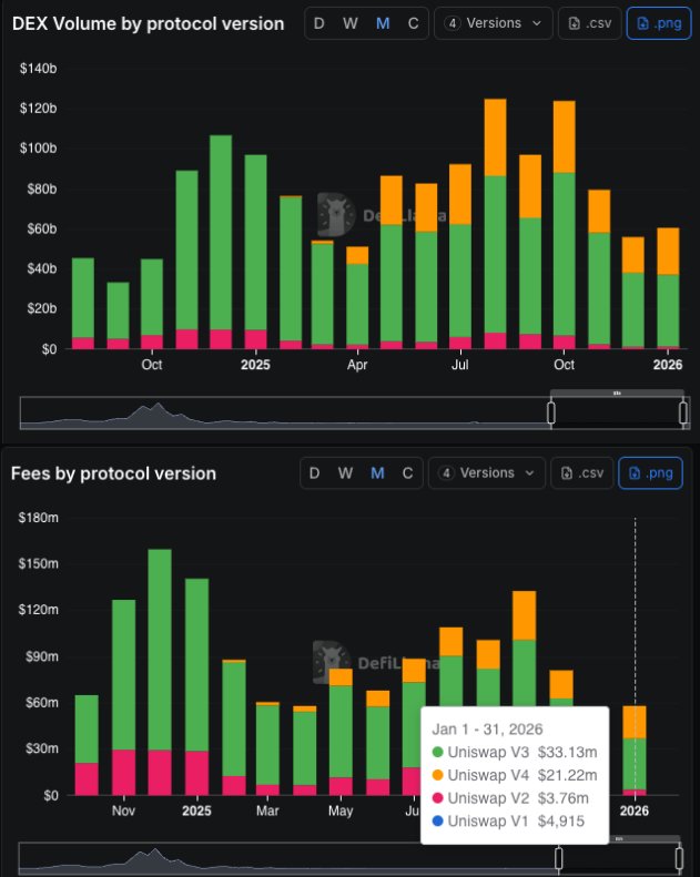 I found fees and volume on @DefiLlama for all Uniswap versions here. It doesn't show an up and to the right chart, but it's not dying usage: