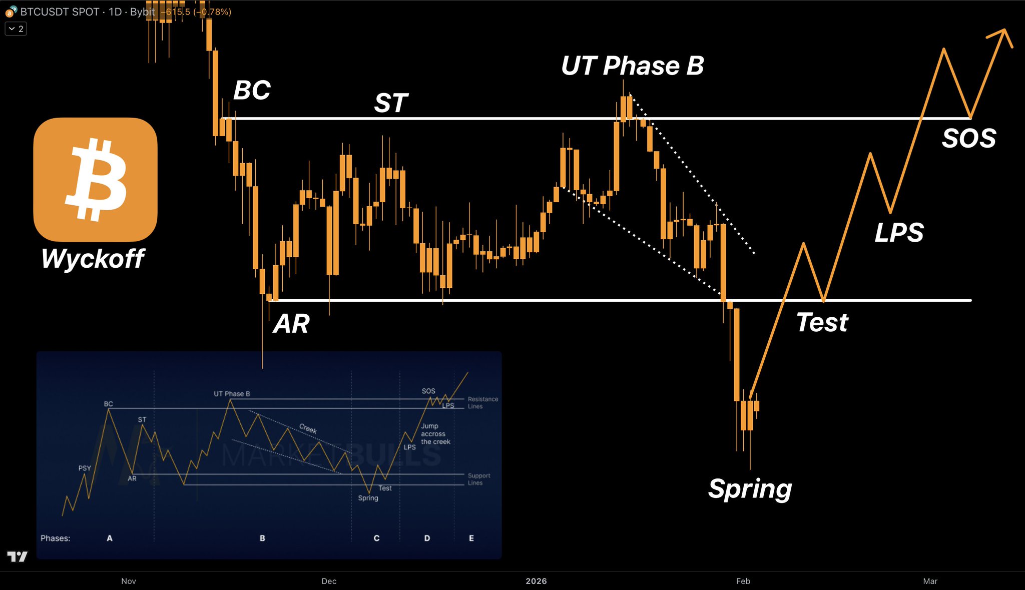 BTC completed Wyckoff accumulation “spring” structure, indicating an imminent rise phase.