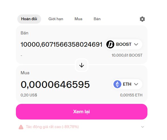 BOOST token was delisted and lacks liquidity, trades show a -89.78% price impact, and it is labeled as the "scam of the century".