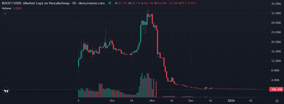The BOOST token has dropped over 99% within 3 months, the chart shows a severe crash, and the project's actions are being questioned.