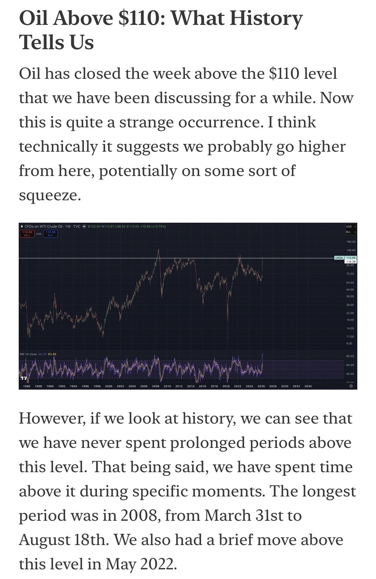 That being said, I do not think the global economy can sustain oil at these prices for long. And if you relate those previous periods where we traded above this level to what was happening globally at the time, it starts to fit into that problem reaction solution dynamic.