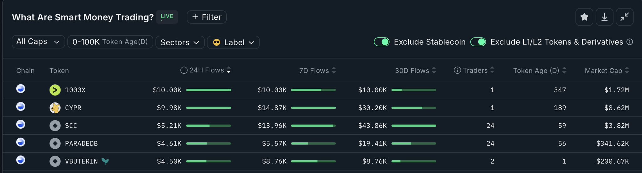 CYPR is the #2 token by smart money inflow on the Base chain, with positive multi-period flows, indicating early investment potential.