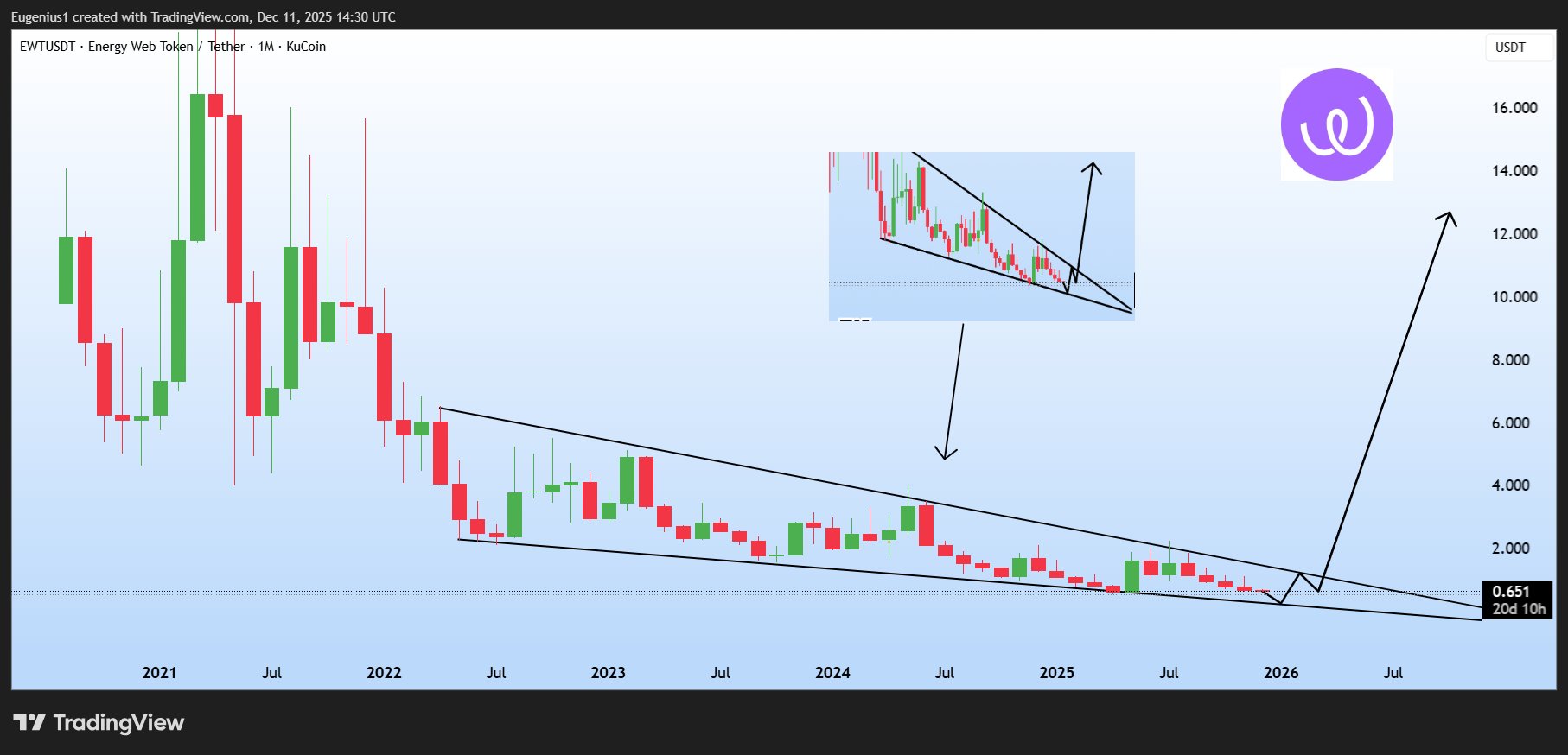 I Like the chart and began accumulating here, will look to add more if $BTC continues to fall over the coming months, a drop on $EWT to the bottom of the falling wedge at around .36c would be an ideal area to add, set some alerts, the ESG and Carbon Credits narrative will pick up speed coming into 2030