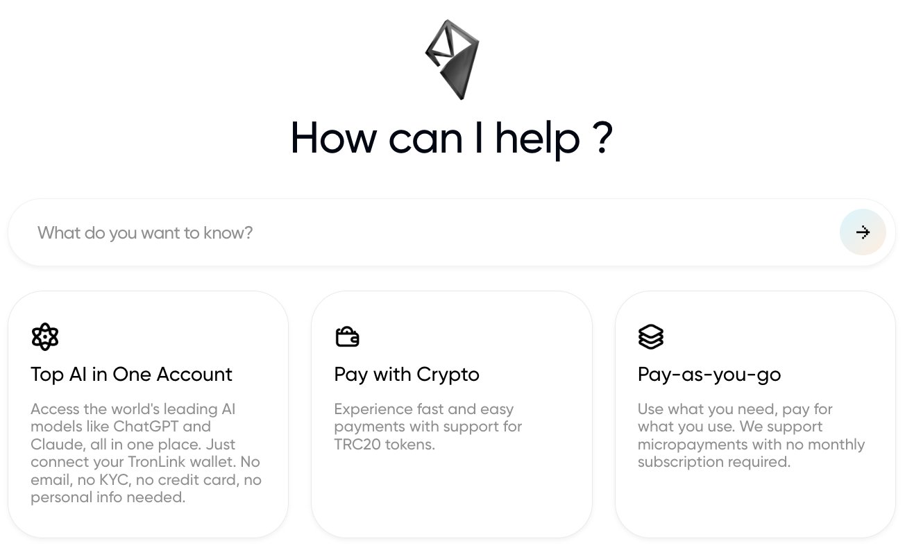 AINFT platform provides a one-stop AI service, supporting TRC20 token payments, no KYC required.