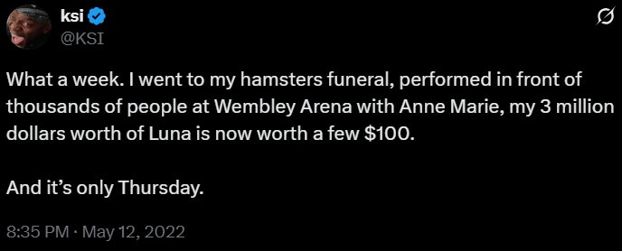 Celebrity KSI suffered huge losses on LUNA, warning of the high risks in cryptocurrency investment.