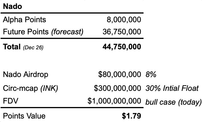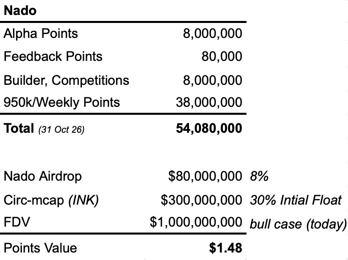 This is based on a $300m market-cap, 30% $INK initial float, and 8% allocated to Nado. Tydo is expected to get 4%, so this might be a bit optimistic.