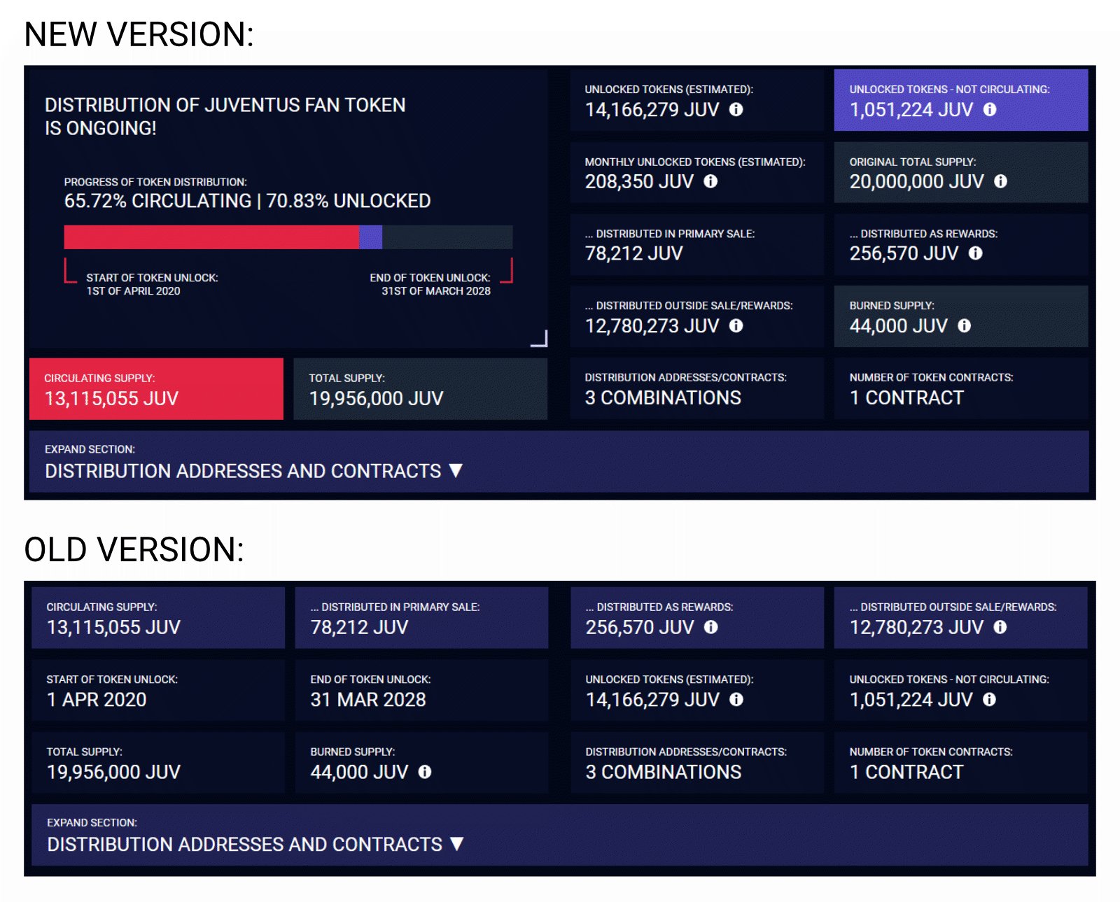 New feature on Rocketfan: The distribution section on each Fan Token's page was completely reworked. It now visualizes the percentage of circulating tokens better and, if available, also displays the amount of unlocked tokens that can be distributed. Comparison of old/new: https://t.co/63FOpTb0AK
