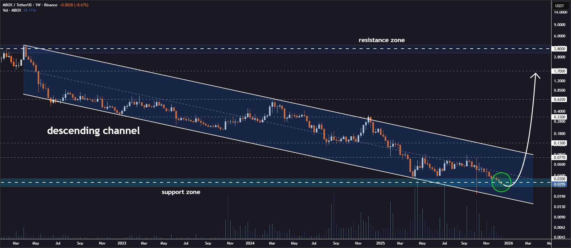 #MBOX Weekly Channel Opportunity🔥\n\nThe token is trading near the support zone inside the descending channel formation on the weekly timeframe🧐\n\nConsolidation around this zone indicates a potential buying opportunity👨💻\n\nA confirmed rebound might lift the price toward targets at $0.077, $0.130, $0.330, $0.620, and $1.700🎯