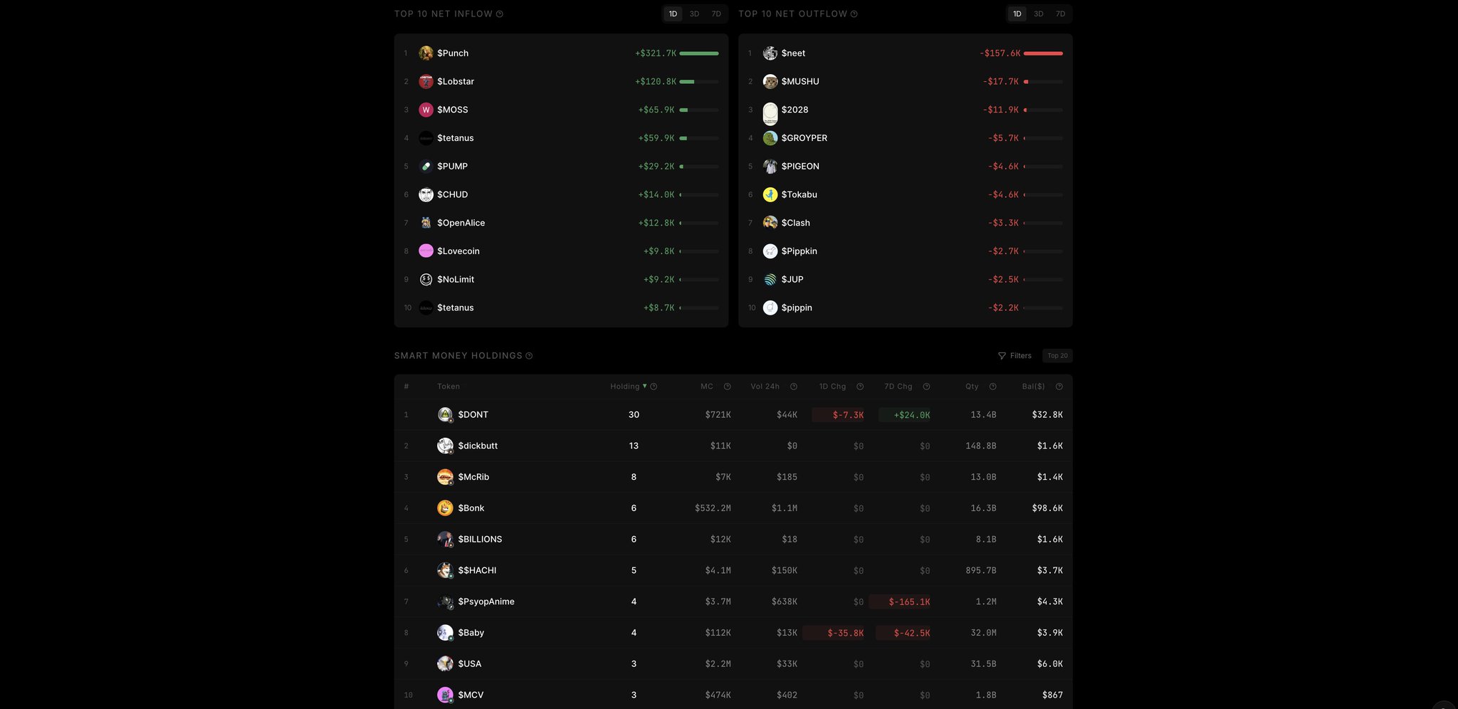Smart money inflows and outflows across multiple meme tokens, market neutral.