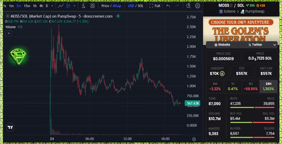 Moss Y. Gravel | $MOSS saw some insane volume these past 24 hours. Lots of interesting wallets involved with this play so definitely one to keep an eye on. Dipped heavily these past few hours, lets see if it can rebound.