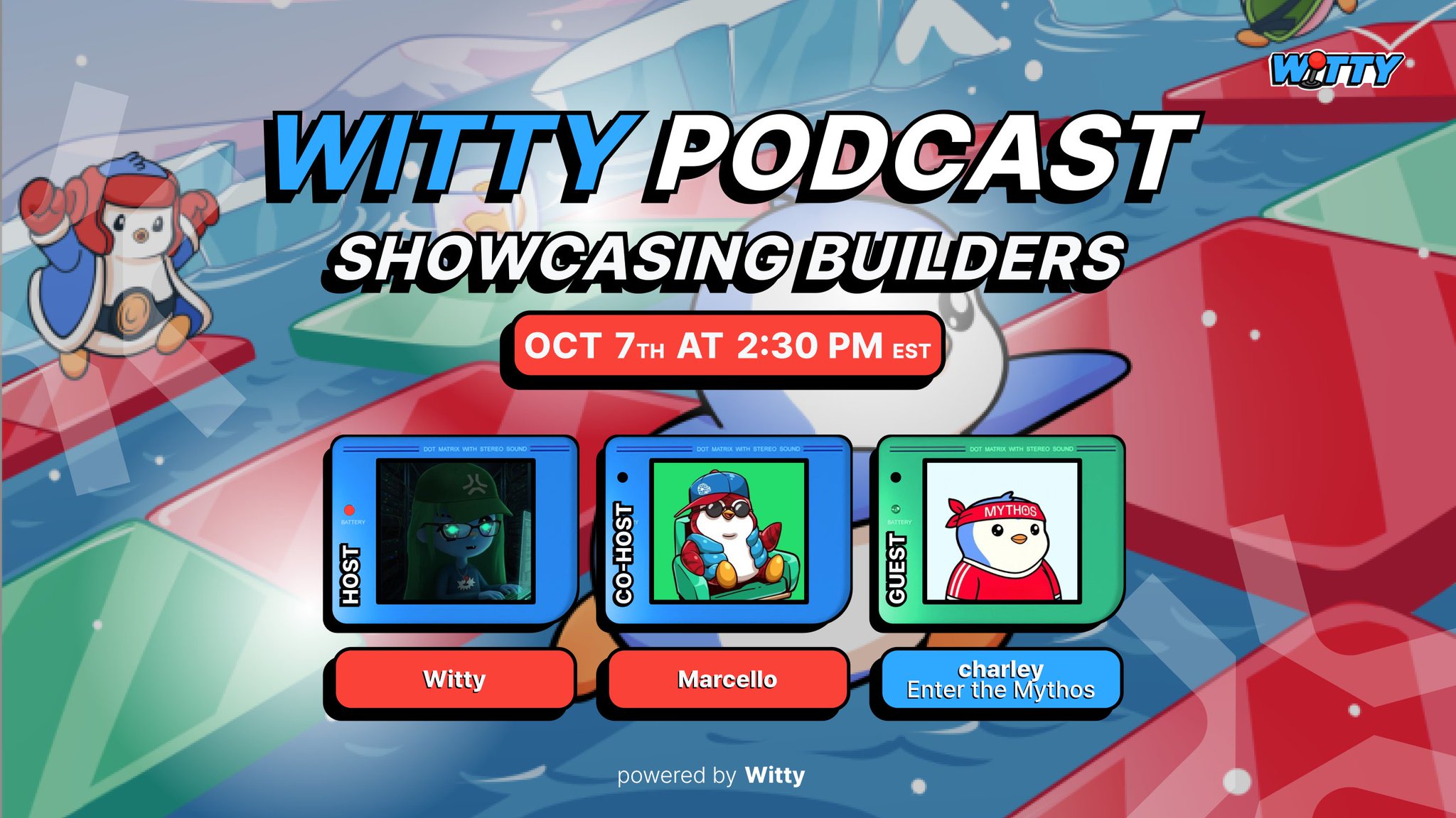 The tweet announces that the Witty podcast will discuss the @PlayPudgyParty project, featuring Charley from Mythos, with no direct trading guidance.