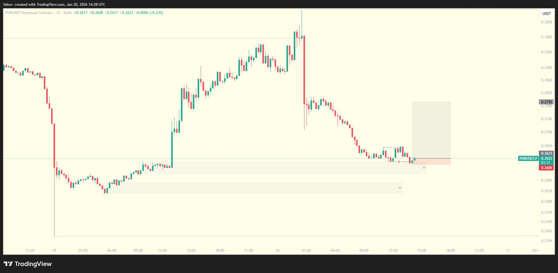 PHB/USDT trading strategy, recommended entry at 0.2623, target 0.2793, stop loss at 0.2605.