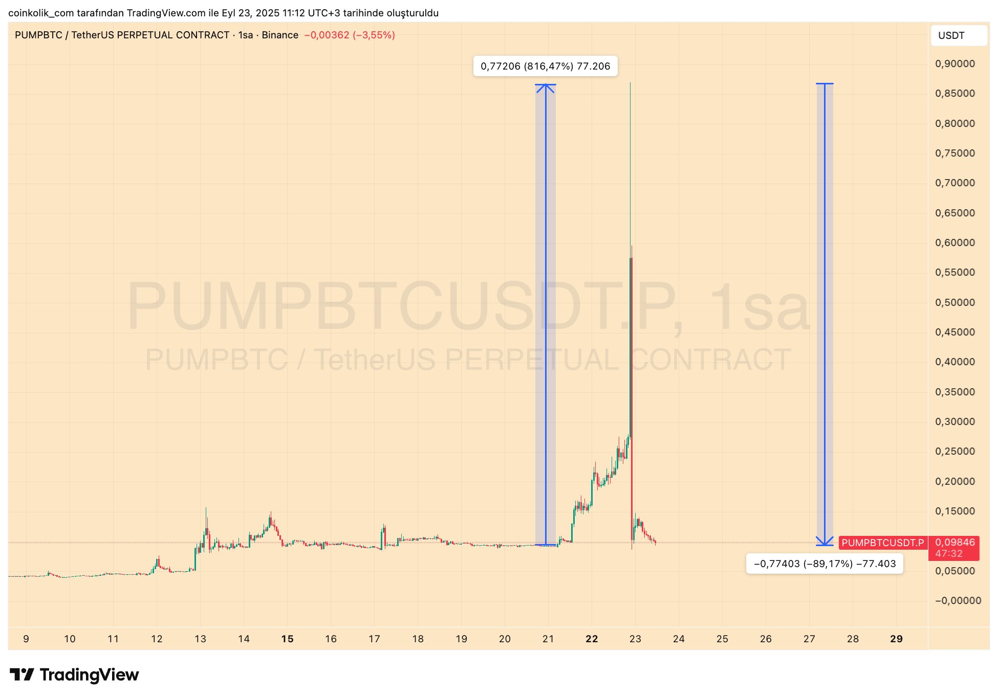 Binance-listed $PUMPBTC surged over 800% in two days, then plummeted 89% in one hour, signaling extremely high risk.