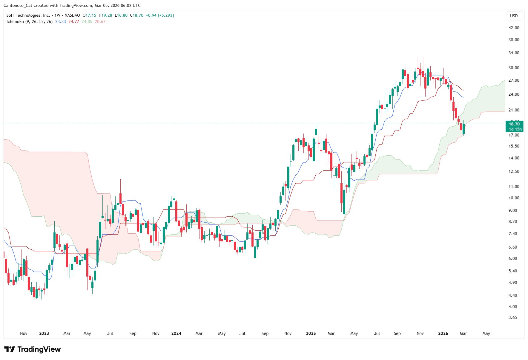SOFI's price finds support near the weekly Ichimoku cloud, but the author doubts its effectiveness.