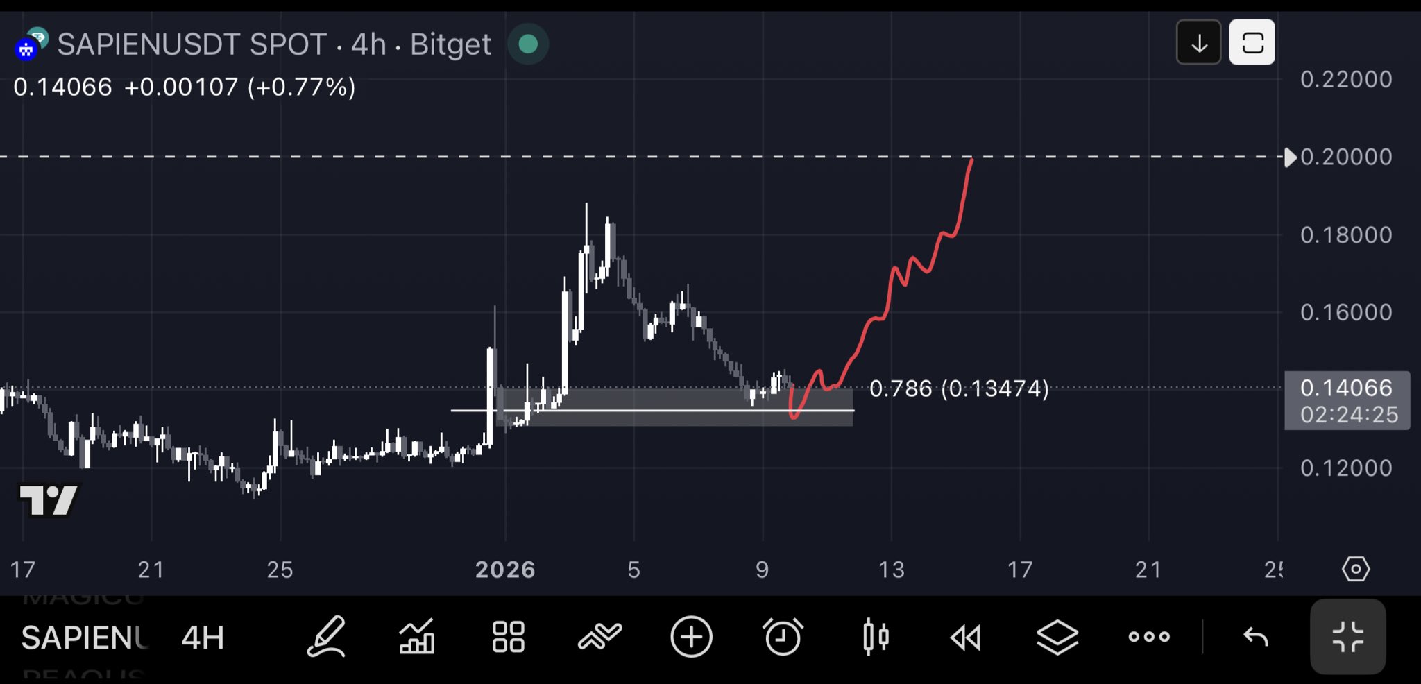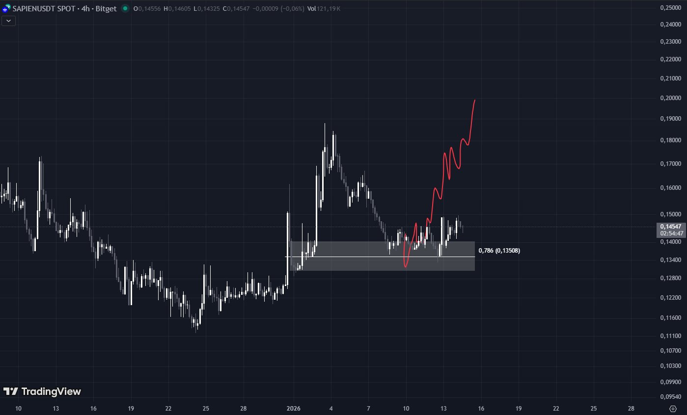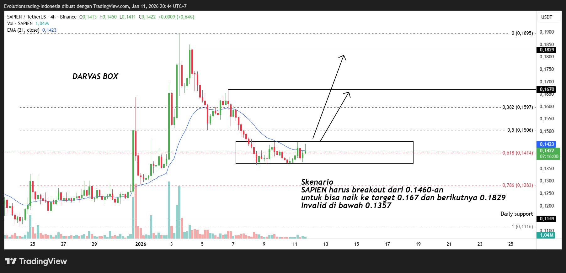 SAPIEN forms a Darvas Box pattern; if it breaks above 0.1460, it may rise to 0.167 and 0.1829