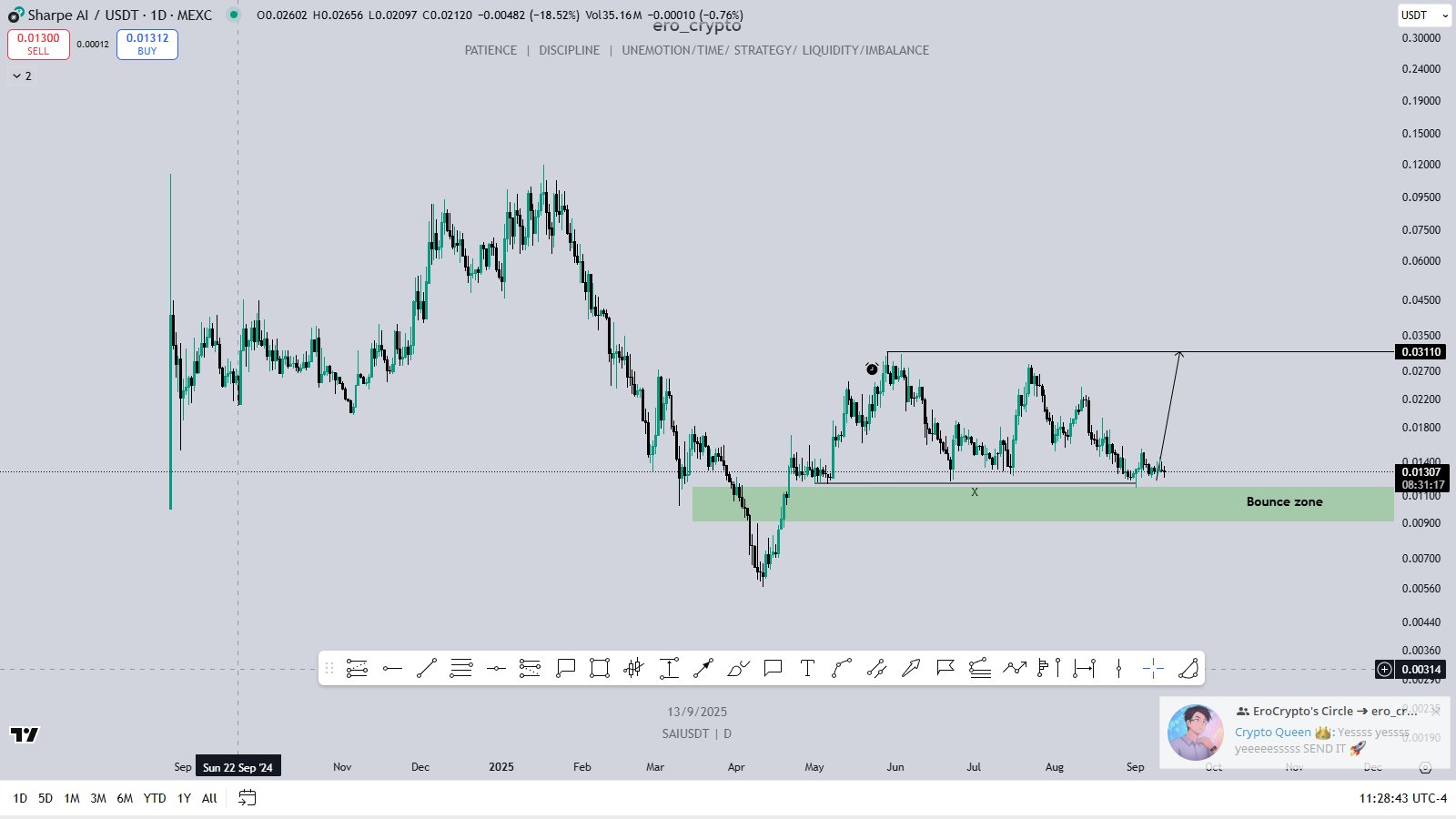 SAI has touched the 'bounce zone' shown in the chart, indicating a potential rise to $0.03110.