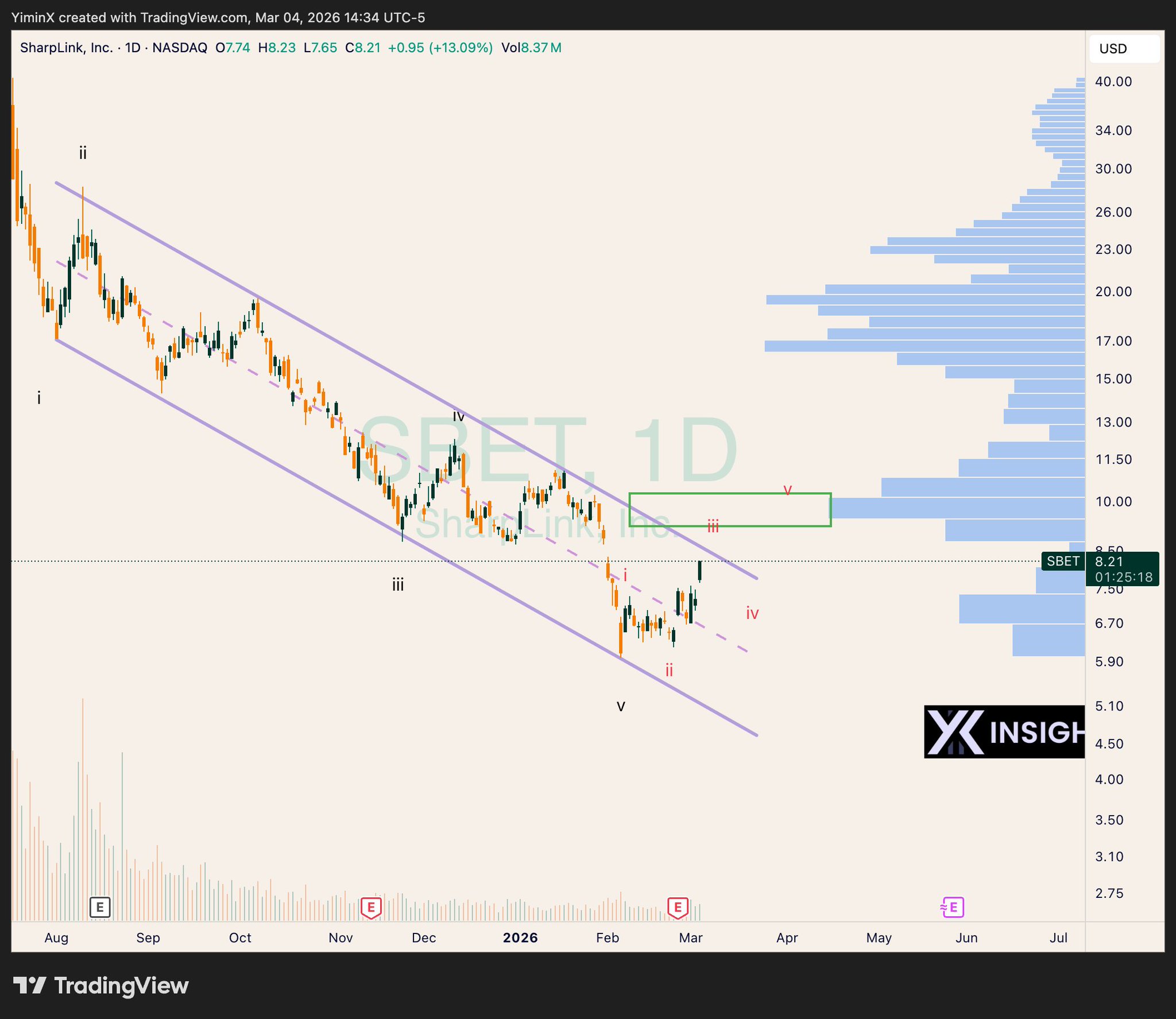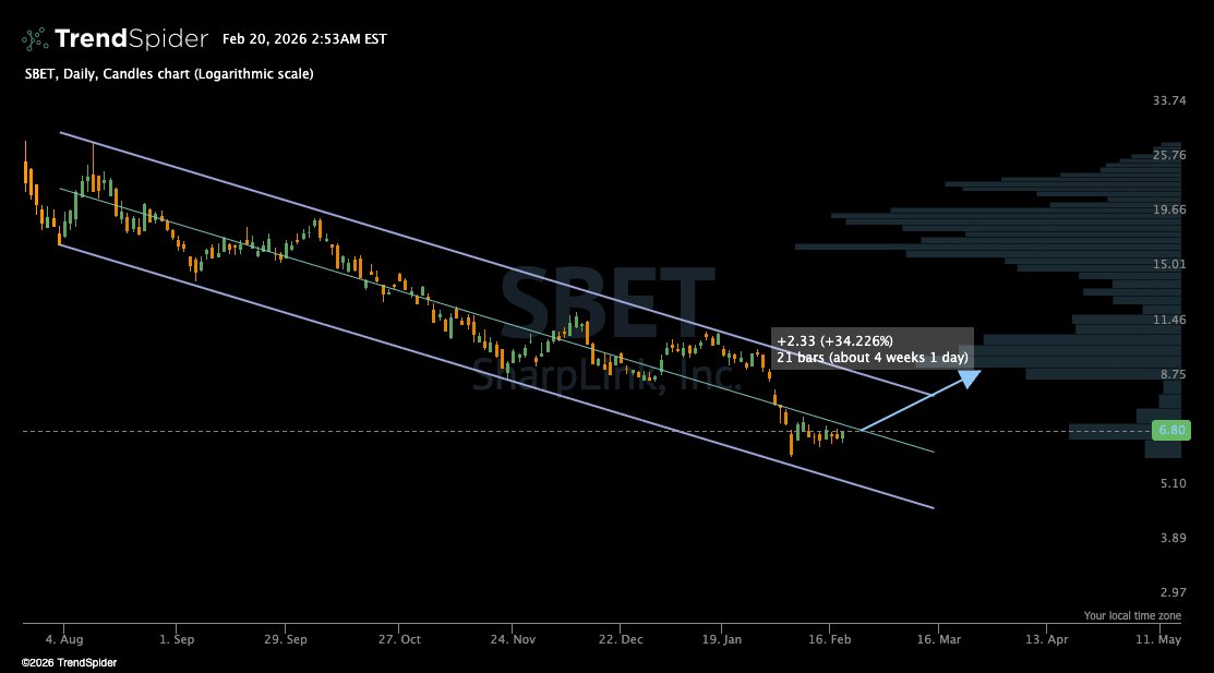 SBET is up 13% but still needs to break the downward channel to confirm a trend reversal.