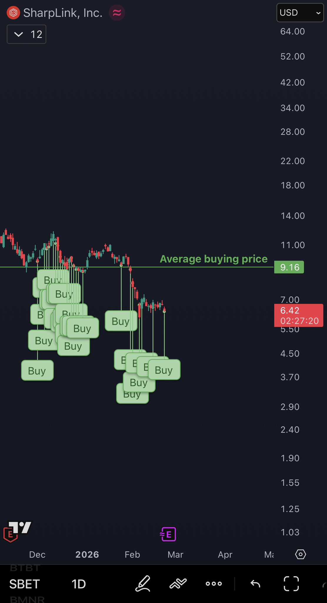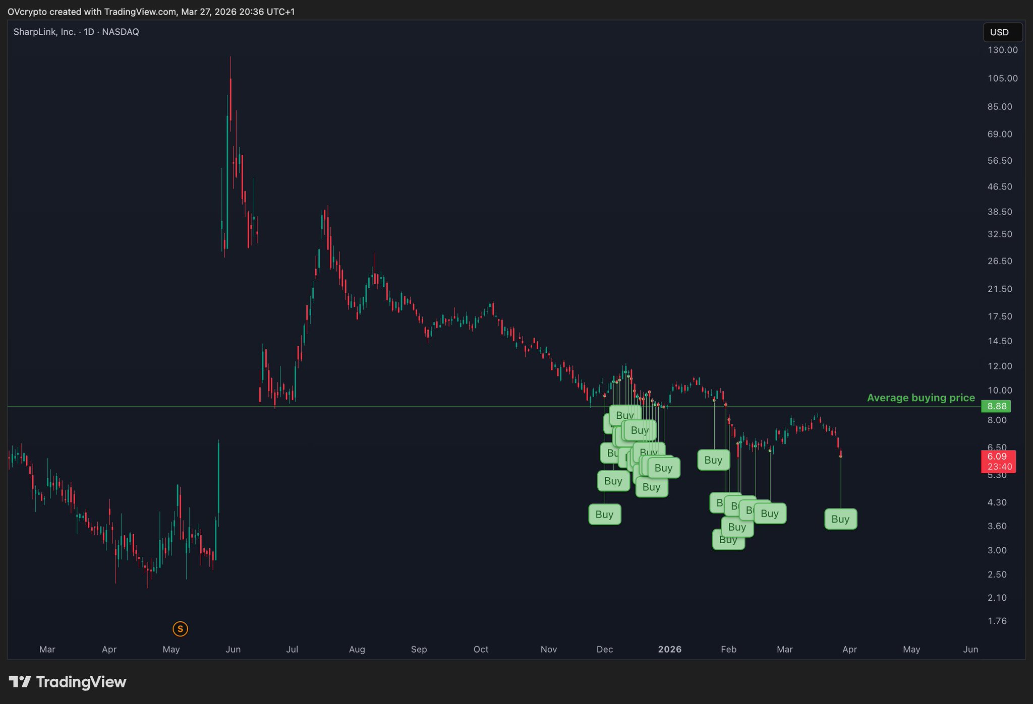 The author continues to buy SBET amid market panic, hoping for gains from an Ethereum reversal.