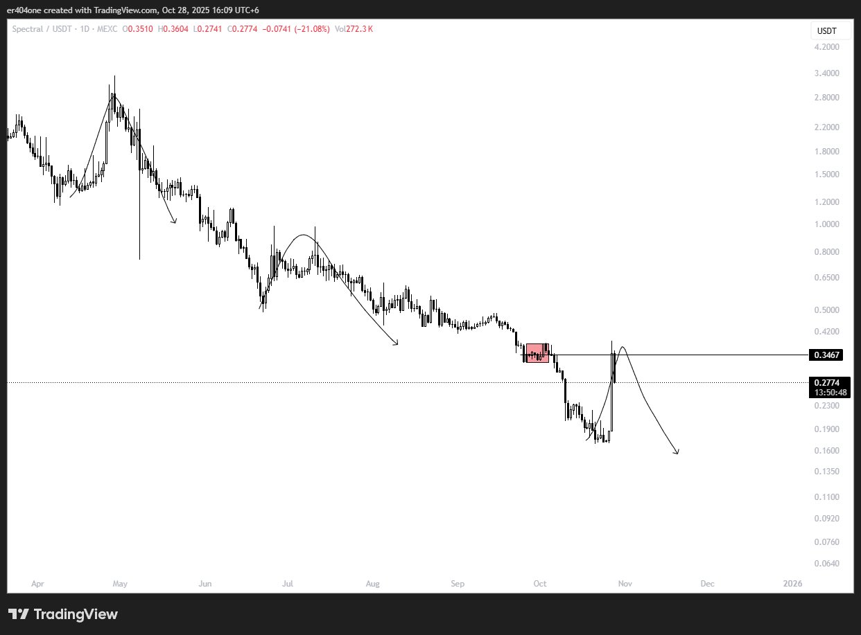 $SPEC technical chart indicates a potential short-term rebound to the $0.3467 resistance level, followed by a continued decline.