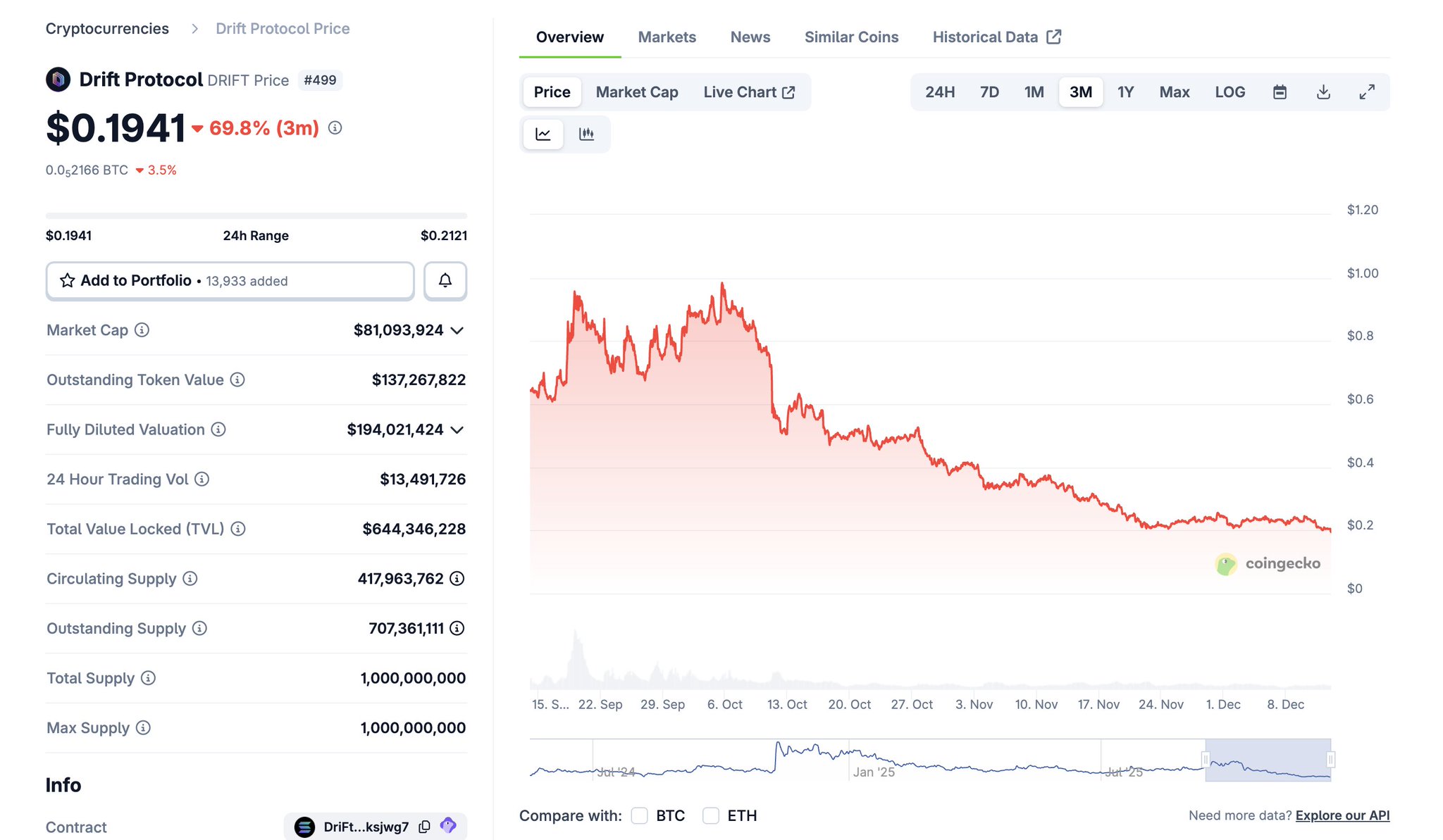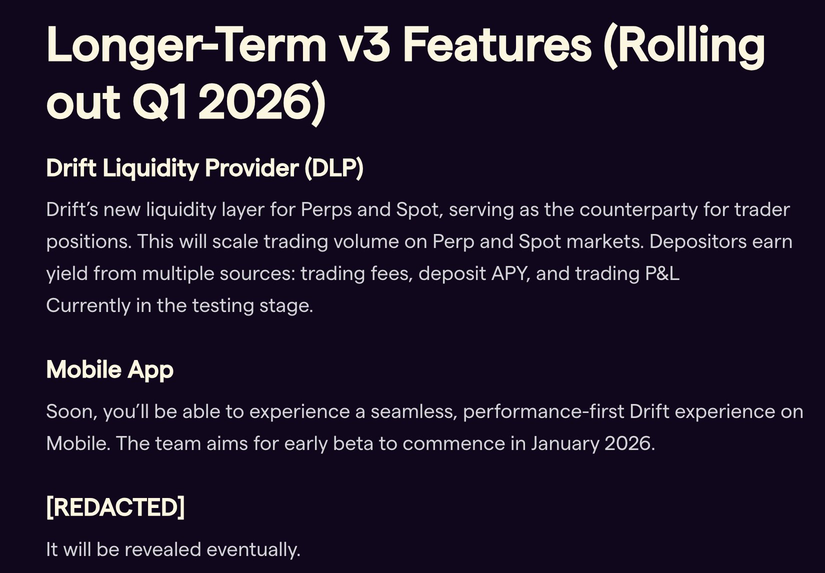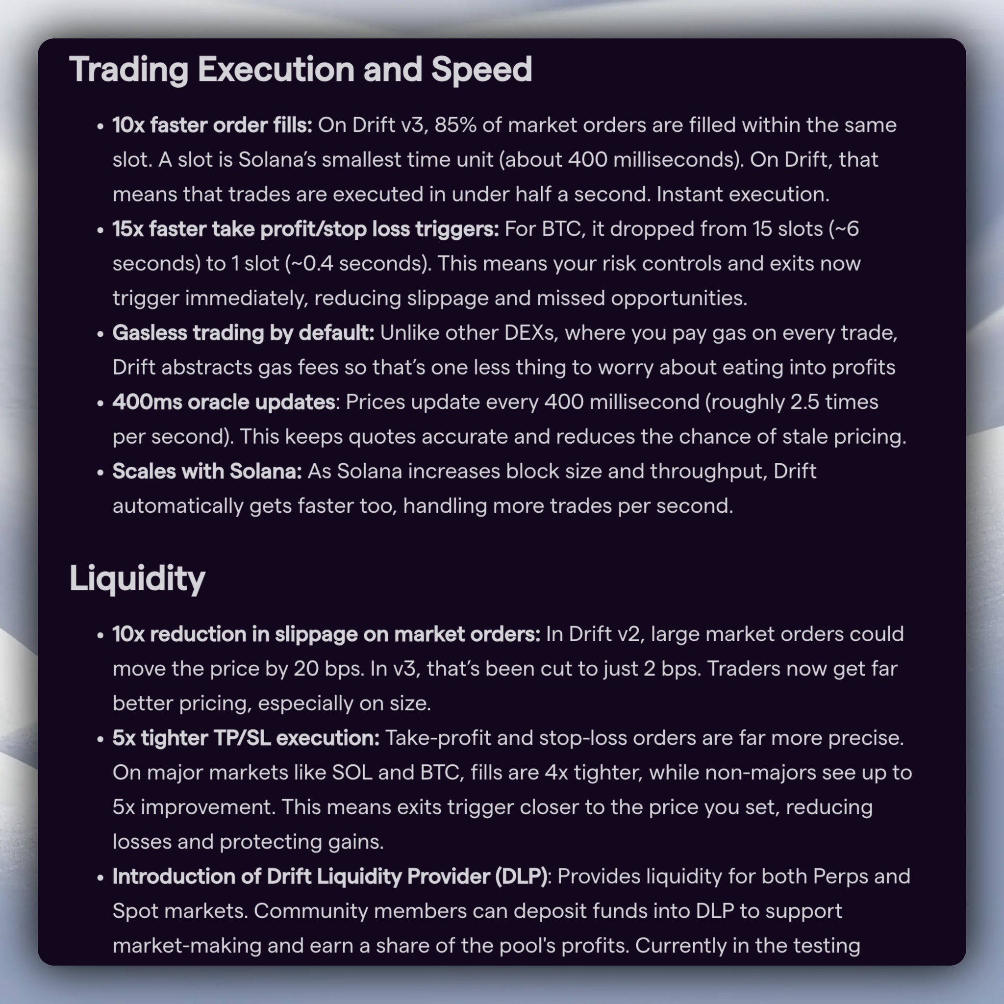 arndxt OnChain_Analyst Educator B46.73K @arndxt_xoif you listened to their latest townhall, one of the most OG perps on solana is making over $40m in revenue is launching their v3 most people are sleeping on this. @DriftProtocol been grinding for 3+ years, $135B in volume, $1B TVL, $42M in revenue. they're the only cross-collateral perp DEX running 47 assets as collateral across 52 pairs. what excites me is their v3, basically positioning to compete against @binance, and their v3 launches just when binance blockchain week is happening just right before @SolanaConf. over the past year, $DRIFT has evolved in three critical areas: • execution speed • liquidity depth • trader experience breaking down the key notes in their townhall 👇 here is what Drift v3 promises to deliver: - 10× faster fills: 85% of market orders execute within the same Solana slot (~400ms). - instant risk controls: TP/SL triggers improved from ~6s to ~0.4s on majors - gasless by default: no per‑trade gas fees eating into PnL. - scales with Solana: more throughput = Drift auto‑gets faster. liquidity would also improve: - 10× lower slippage: market impact on size cut from ~20 bps → ~2 bps. - tighter TP/SL execution: 4–5× better pricing accuracy across majors and long‑tail markets. - DLP (Drift Liquidity Provider): community‑funded liquidity for perps + spot; profit‑sharing pool launching Q1 2026. - expanded MM program: long‑tail alts now have spreads and depth comparable to majors. - @jito_sol BAM integration (coming): enforced cancel‑before‑take protects MMs from toxic flow, enabling tighter spreads and deeper books. @cindyleowtt also mentioned that they will have DLP in Q1 2026: - Drift Liquidity Pool becomes the counterparty to every perp position. LPs earn trading fees directly. - development is done, testing phase now. - watched GLP scaled to $500M+ and create a flywheel that made @GMX_IO $GMX unstoppable. - DLP is that model but with better capital efficiency because of Drift's multi‑collateral system. more assets = higher utilization = more yield = more TVL. - the flywheel becomes active interesting thing is that mobile app is mentioned Q1 2026 - Drift's mobile app is going to be the first for a perp dex on $SOL - this is the largest distribution unlock looking at the success of @edgeX_exchange's mobile app. desktop‑only is a ceiling. - mobile is how you go from $1B TVL to $10B. retail can't access Drift from their phone right now, this will change in 90 days. - i think this will 5-10xs user acquisition immediately.