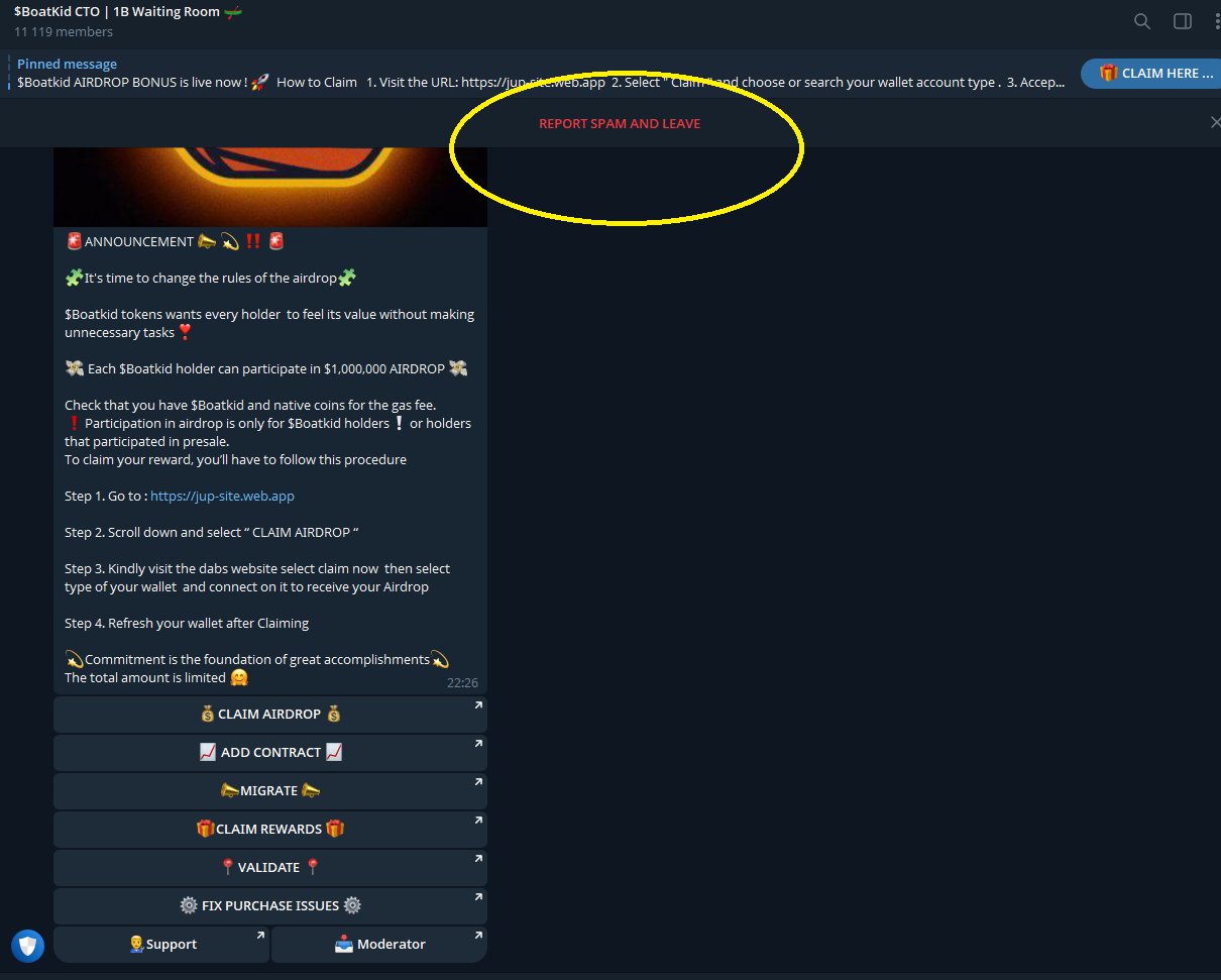 The tweet warns that the $Boatkid airdrop on Telegram is a scam, advising not to participate and to report it.