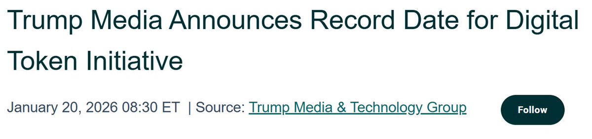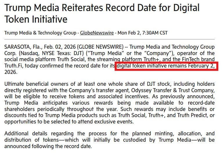 @TMTGcorp (DJT) said Feb. 2, 2026 will be the record date for its digital token initiative. Shareholders holding AT LEAST one share by then will be eligible to receive tokens.