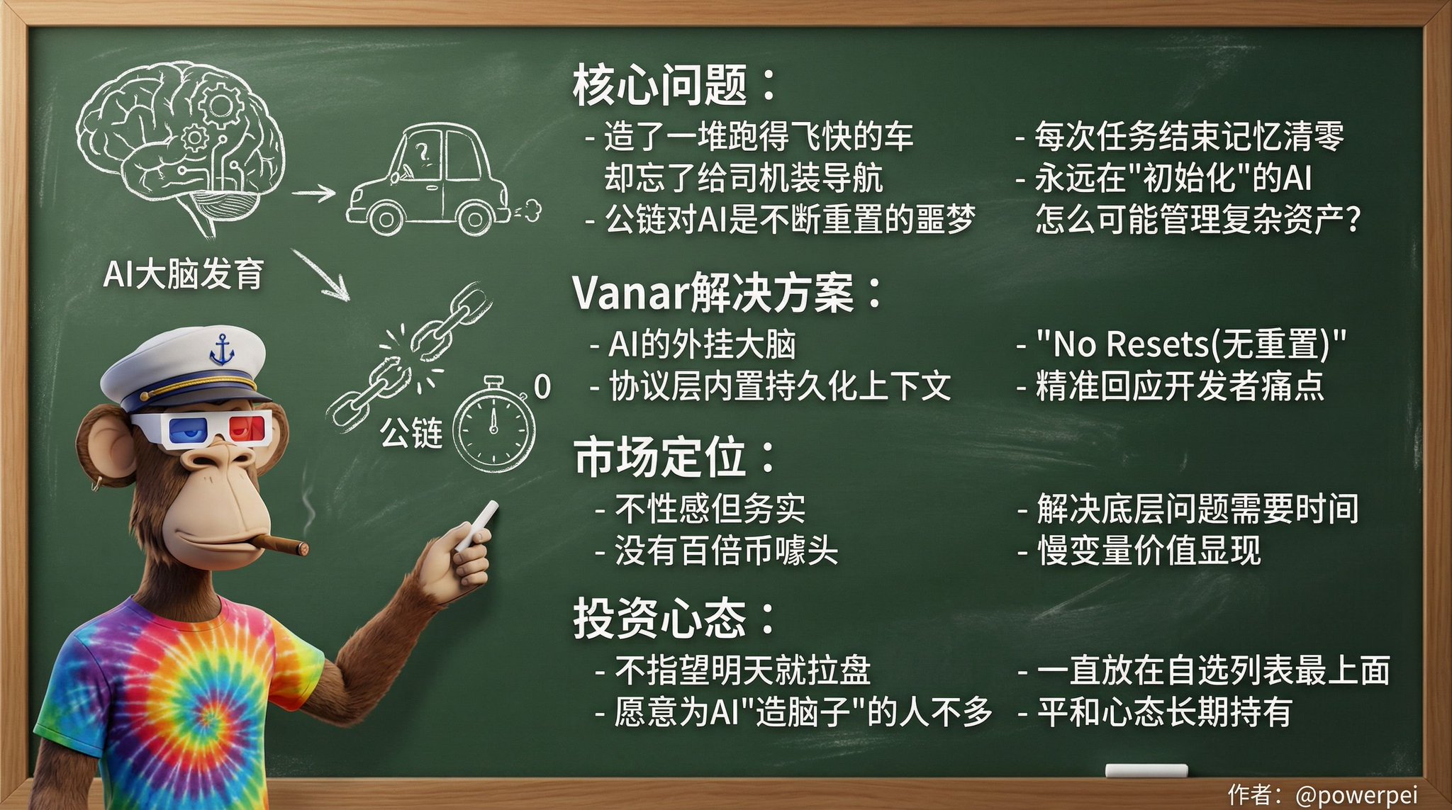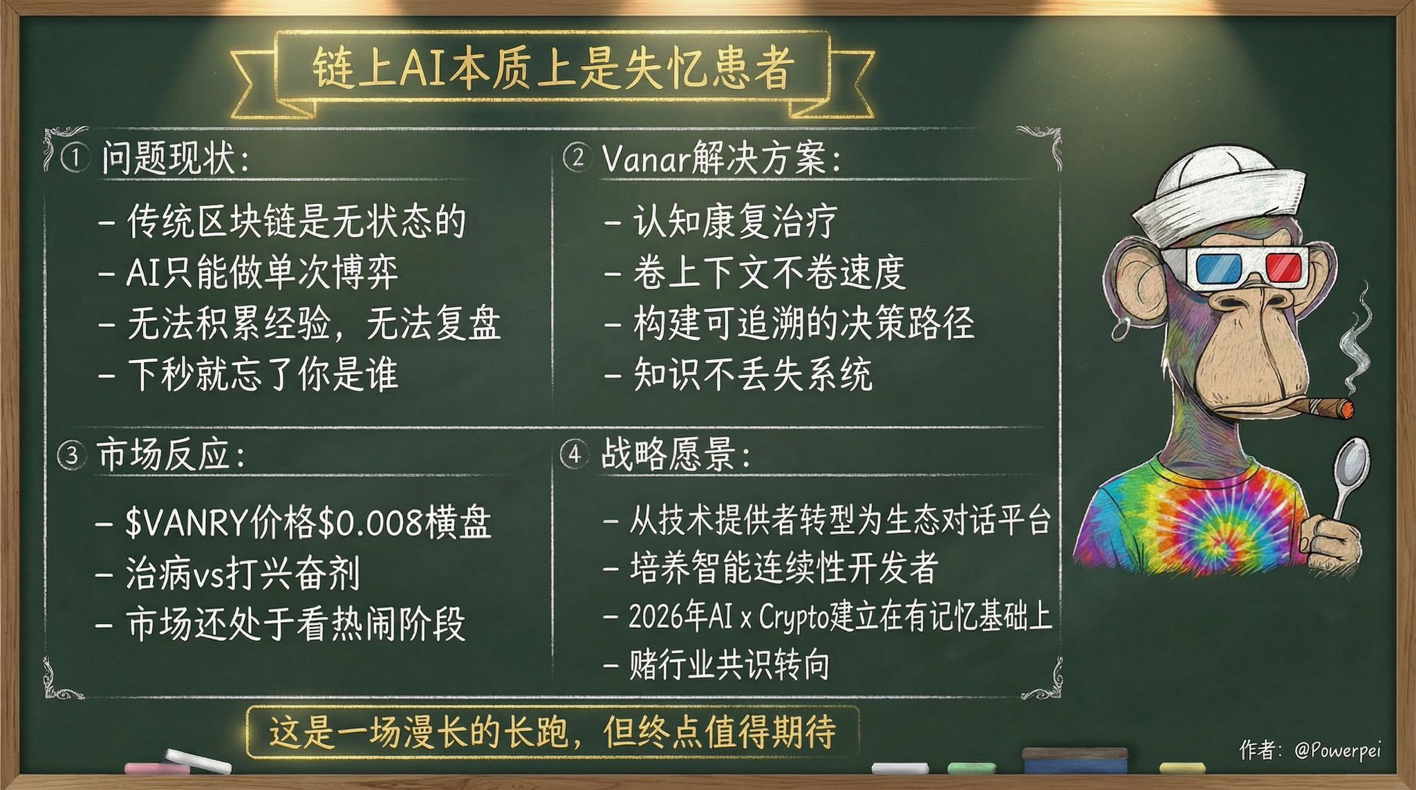 Powerpei.ip FA_Analyst OnChain_Analyst A12.43K @PWenzhen76938Yesterday @Vanarchain's AMA, guest @iffykan004 presented a painful insight: "Current on-chain AI are essentially amnesiac patients." The statement sounds harsh, but upon reflection, it's completely true. Traditional blockchains are stateless. They only care whether "this transaction is valid right now" and completely ignore "what happened before this transaction." This leads to AI Agents on-chain being able to engage only in "single-shot games" They cannot accumulate experience, cannot review, and even cannot be accountable to you Because they will forget who you are the next second. Vanar's current approach is akin to a cognitive rehabilitation therapy It doesn't compete with you on speed; it competes on Context Through native mechanisms, AI decision paths become traceable, and knowledge is retained. This helps not only AI but also us. After all, who would dare entrust assets to a robot that forgets as soon as it turns around? Market reaction: $VANRY's price is still hovering around $0.008, and after the Space it hasn't surged. That's normal. Because "treatment" is a long process, unlike a stimulant (Meme) that works instantly. The market is still in a "spectator" phase and hasn't realized the importance of "health." //// Powerpei's assessment: Vanar is transitioning from a pure "technology provider" to an "ecosystem dialogue platform". It is cultivating a group of developers who truly understand "Intelligence Continuity (智能连续性)". These individuals are the seed players of the future AI track. If AI x Crypto truly materializes in 2026, it must be built on memory. In this logic, Vanar is essentially betting on a "shift in industry consensus" It's a long marathon, but the finish line is worth looking forward to. #vanar $VANRY