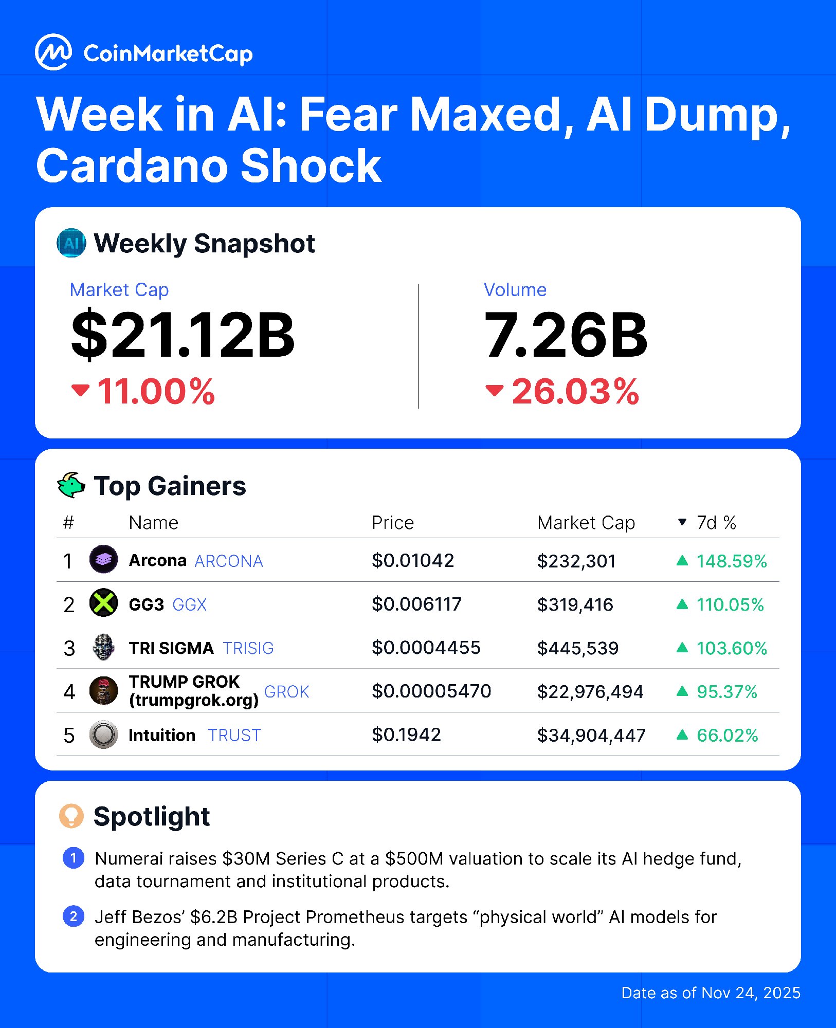 AI加密市场市值下跌11%,ARCONA等少数币种逆势上涨,AI技术获巨额投资。