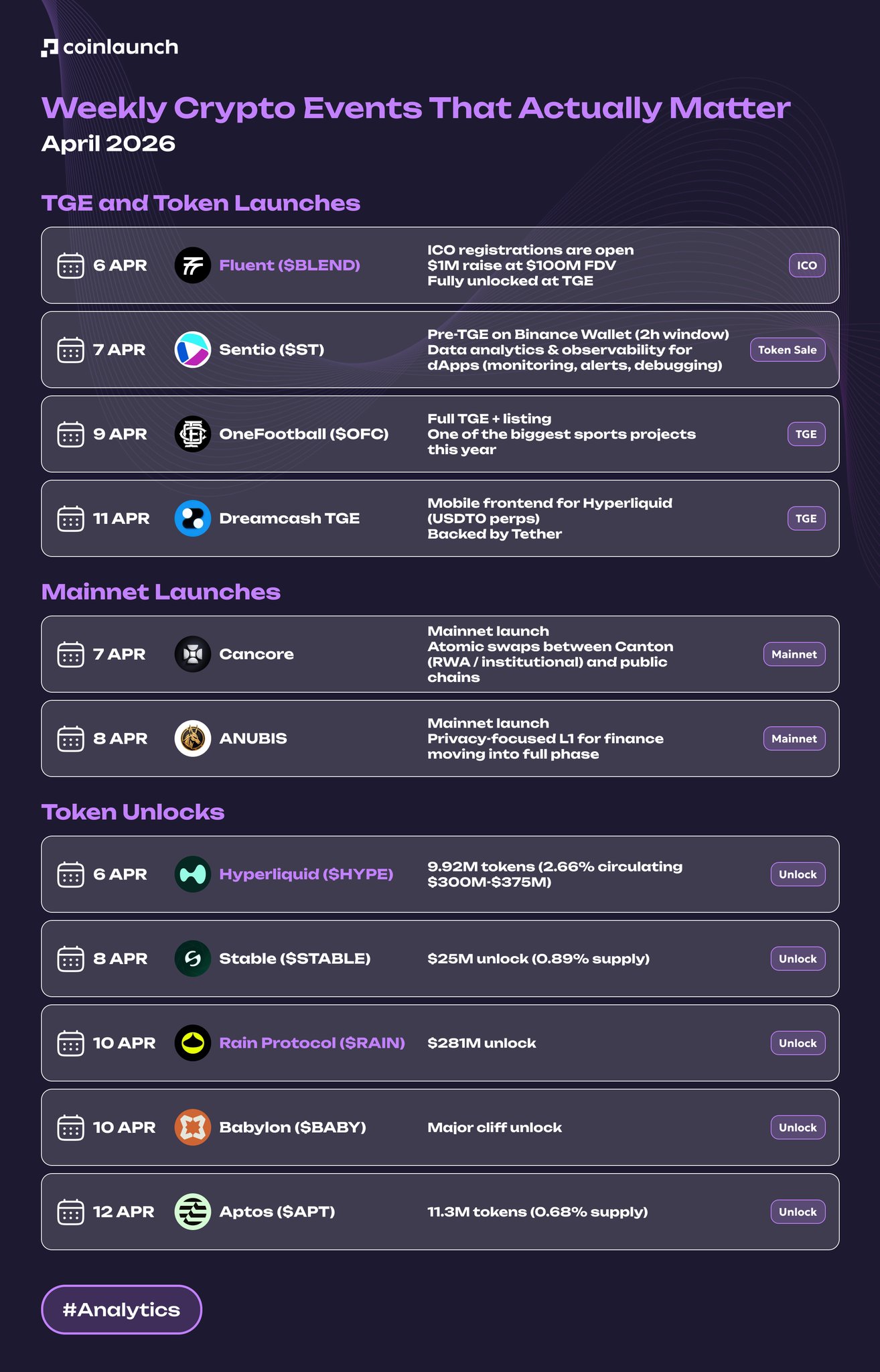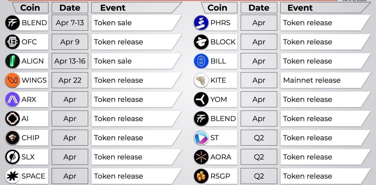 The cryptocurrency market in April 2026 will see important events such as TGE, mainnet launches, and token unlocks.