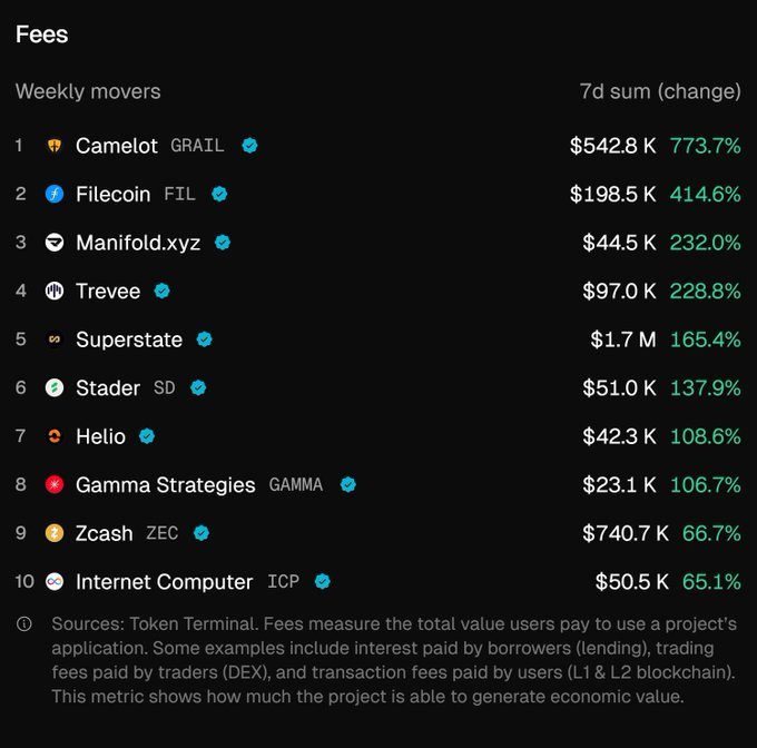 Top projects by fee growth (7d change):@CamelotDEX +773.7%@Filecoin +414.6%@manifoldxyz +232.0%@Trevee_xyz +228.8%@SuperstateInc +165.4%@staderlabs +137.9%@helio_pay +108.6%@GammaStrategies+106.7%@Zcash +66.7%@dfinity +65.1%