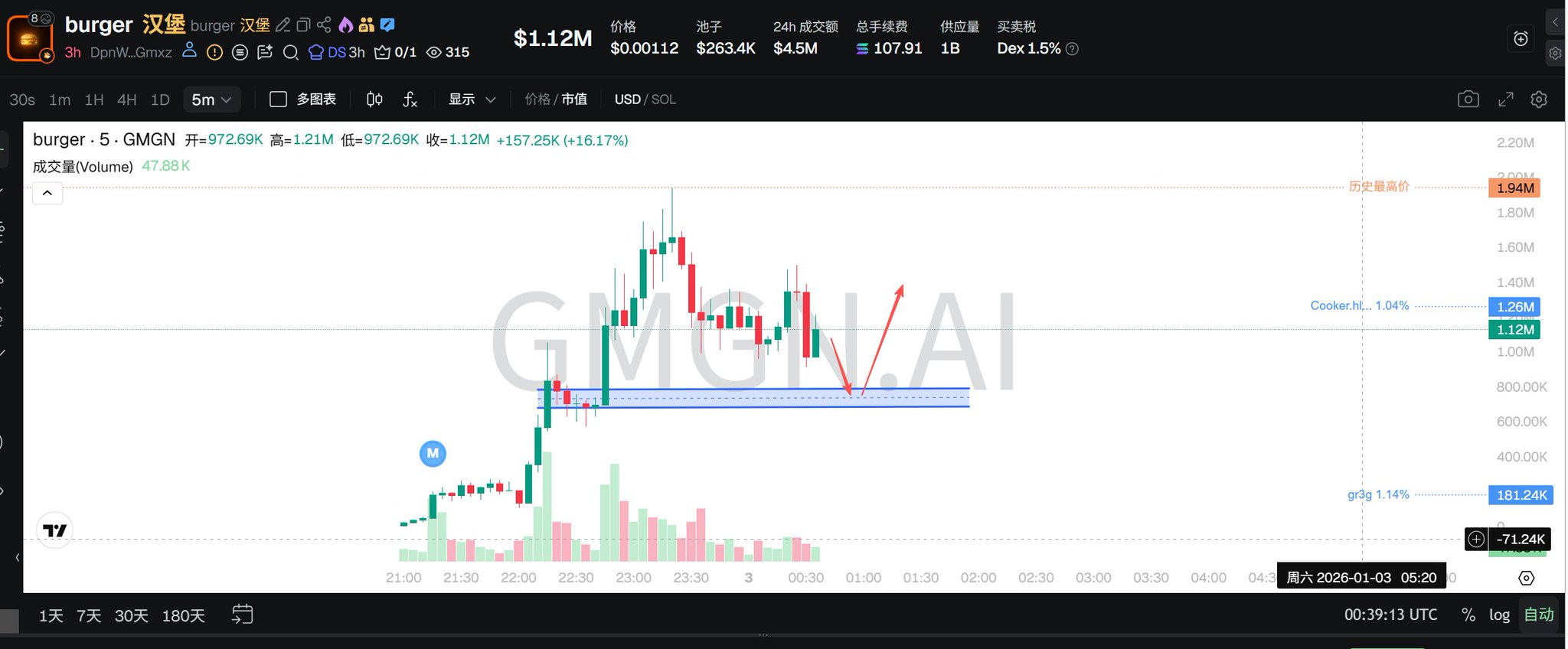 Burger token is experiencing extreme volatility, touching the support level, and the short-term trend remains to be observed.