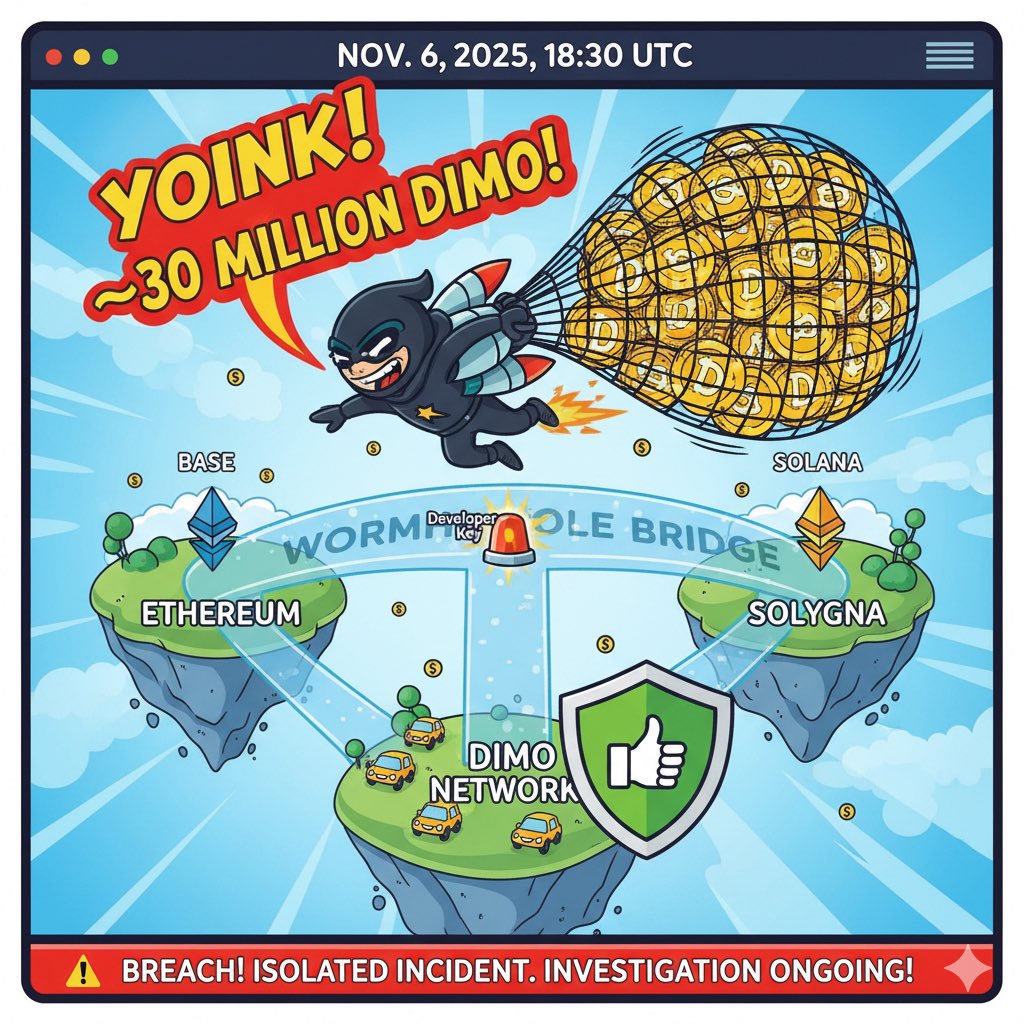On Thursday, November 6, 2025, at approximately 18:30 UTC, the DIMO team discovered an attacker had gained unauthorized access to a developer key, leading to the withdrawal of roughly 30 million DIMO tokens. This amount, valued at about $806,119.50, represents approximately 3% of the total supply.
