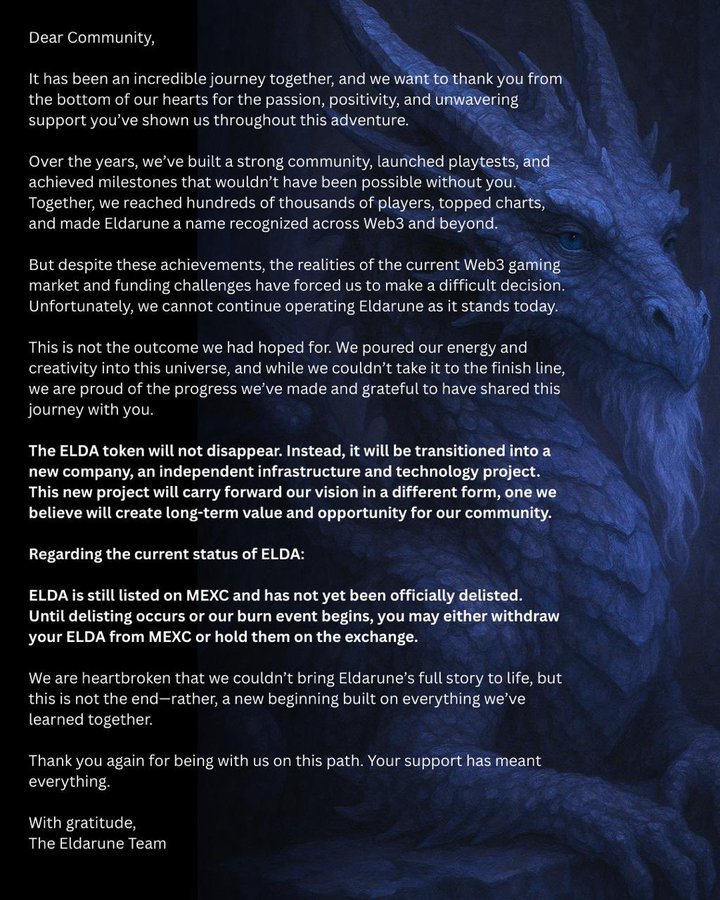 🔴 The shutdown is due to funding challenges in the current web3 gaming market, with the $ELDA token set to be moved to a new company that will “carry forward our vision, but in a different form.”