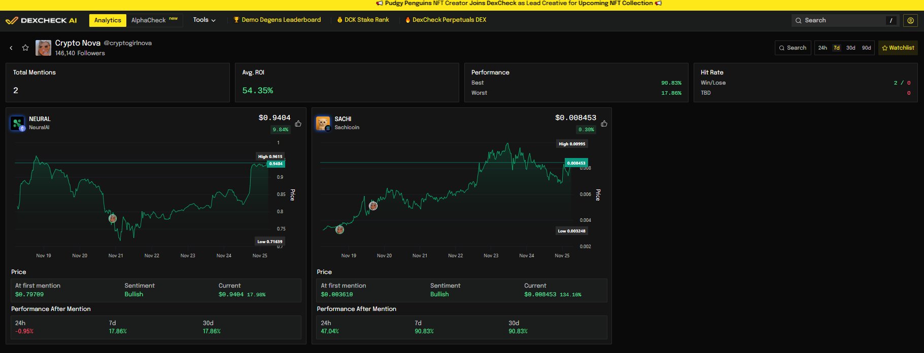 DexCheck reports that KOLs successfully recommended several tokens, such as GIGL up 290% and WOJAK up 84%, demonstrating high ROI.