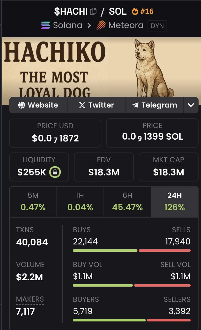 LATEST: $HACHIKO is up 126% in the past 24hrs, briefly breaking the $20 million mark.