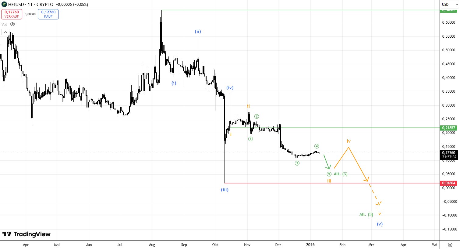 HEI is expected to make 1‑3 new lows, with technical charts indicating it could drop to 0.01804 or even lower.