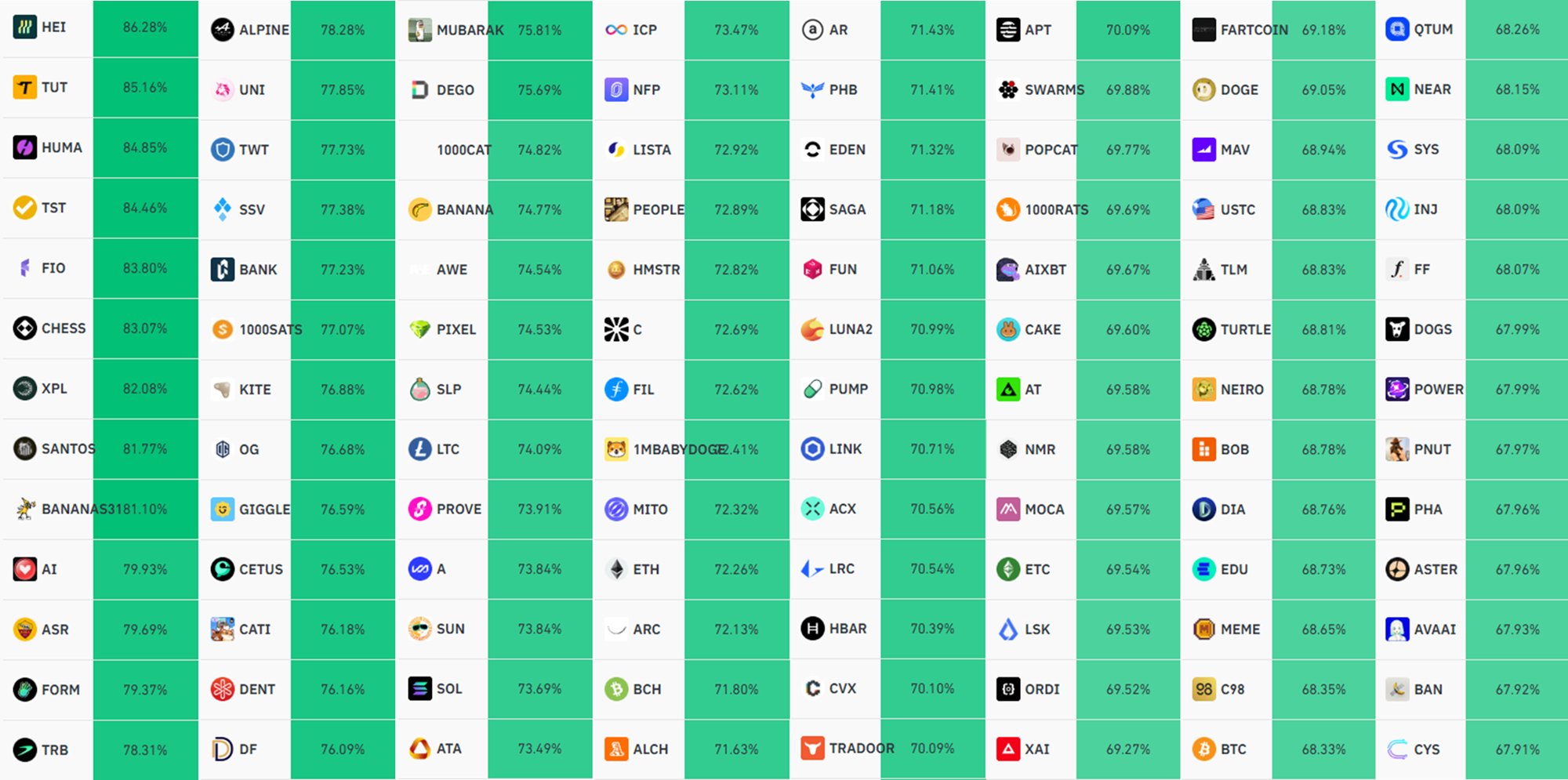 Binance's top traders are extremely bullish on $HEI, $TUT, $HUMA, $TST, $FIO, $CHESS, $XPL, and $SANTOS. Their long position ratios exceed 80%.