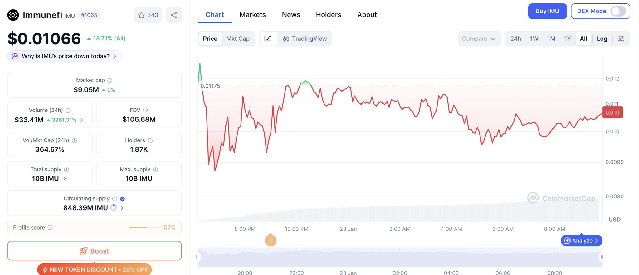 Immunefi (IMU) is a cryptocurrency launched in 2026and operates on the Ethereum platform. Immunefi has a current supply of 10,000,000,000 with 838,396,356.55 in circulation. The last known price of Immunefi is 0.00414214 USD and is down -5.69 over the last 24 hours. It is currently trading on 45 active market(s) with $3,274,373.73 traded over the last 24 hours. More information can be found at https://www.immunefi.foundation/.