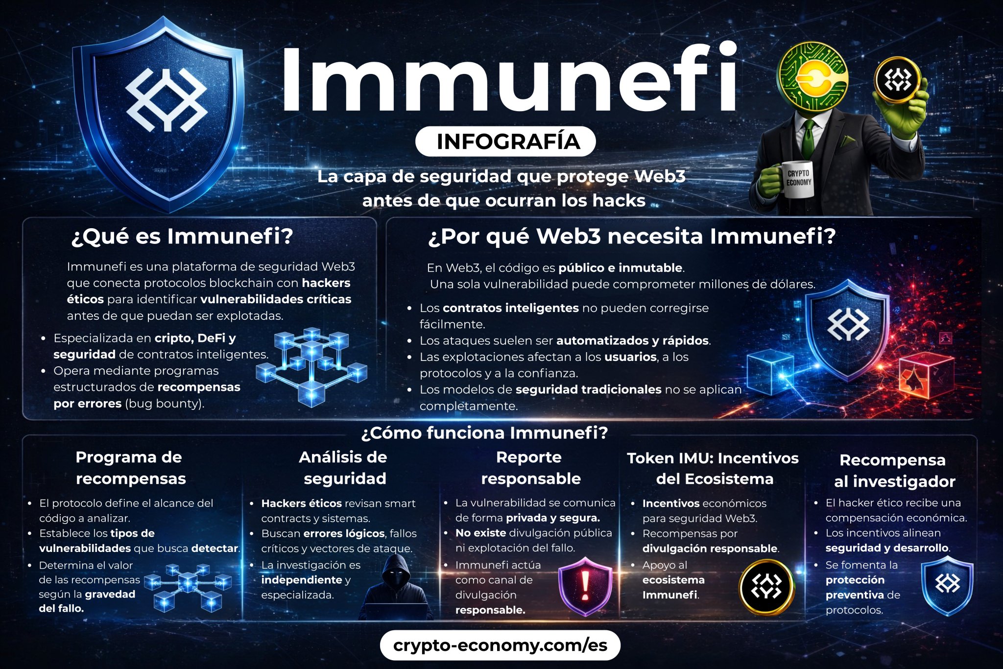 Immunefi enhances Web3 security by coordinating white‑hat hackers, and its IMU token incentivizes ecosystem development.
